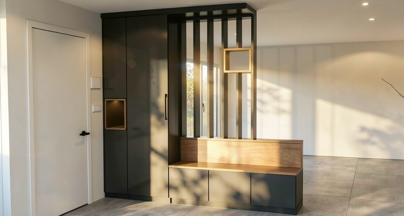 cozy living room modern dining table with chairs and kitchen at the rear hidden lights and spotlights in the false ceiling timber folding doors in the left hand side can be seen in the prompt