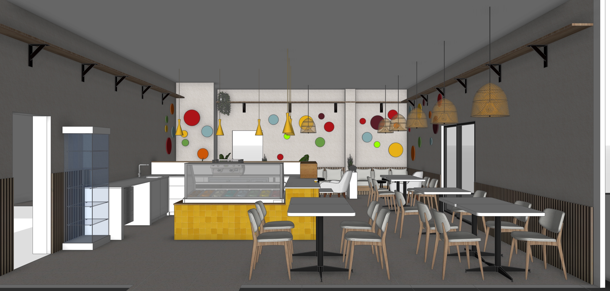 interieur render light shadows keep textures and colours materials light suspensions add plants to shelves backround none white door to the left opening frames and menu to the left wall more plants to shelves under ceiling