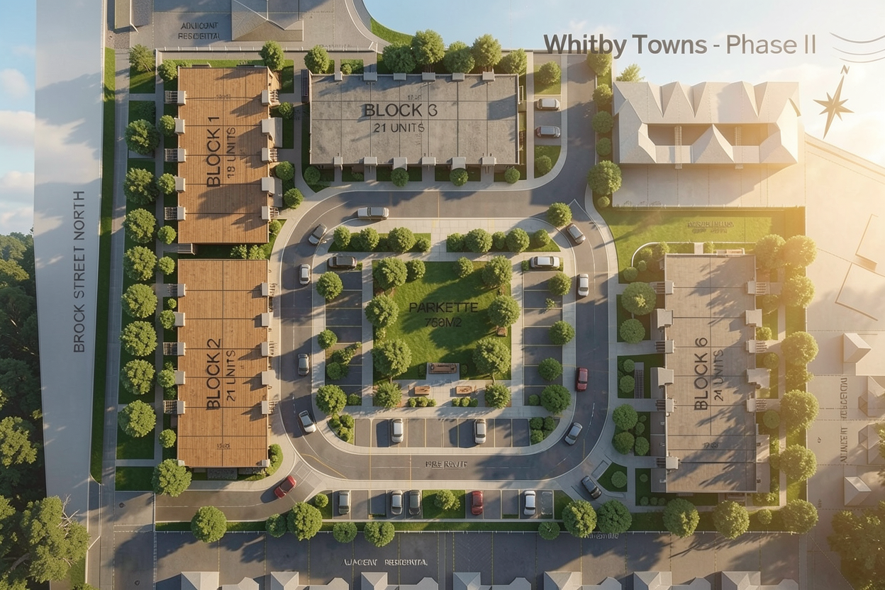 improve the view show angled roof look on the 4 building blocks