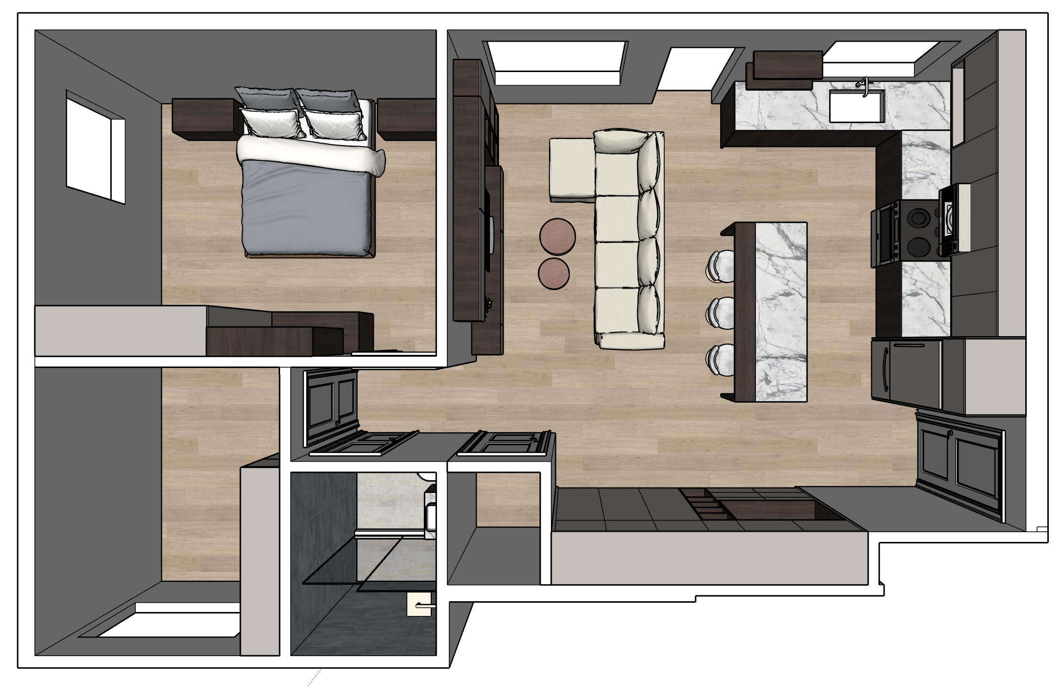 render a cozy modern apartment interior with an open floor plan use soft neutral tones to create a calming atmosphere for the bedroom choose a light gray wall color with a bed covered in soft plush white sheets and two fluffy pillows the bedside tables and wardrobe should be a rich dark wood in the living area include a creamy white l shaped sofa paired with a dark wood tv unit add two round warm colored coffee tables in front of the sofa the kitchen should feature elegant white marble countertops with subtle gray veining complemented by dark modern cabinetry the kitchen island should have high stools with soft gray cushions use light natural wood flooring throughout to enhance the warmth ensure plenty of natural light streams in from the windows creating a bright inviting space with a relaxed welcoming ambiance