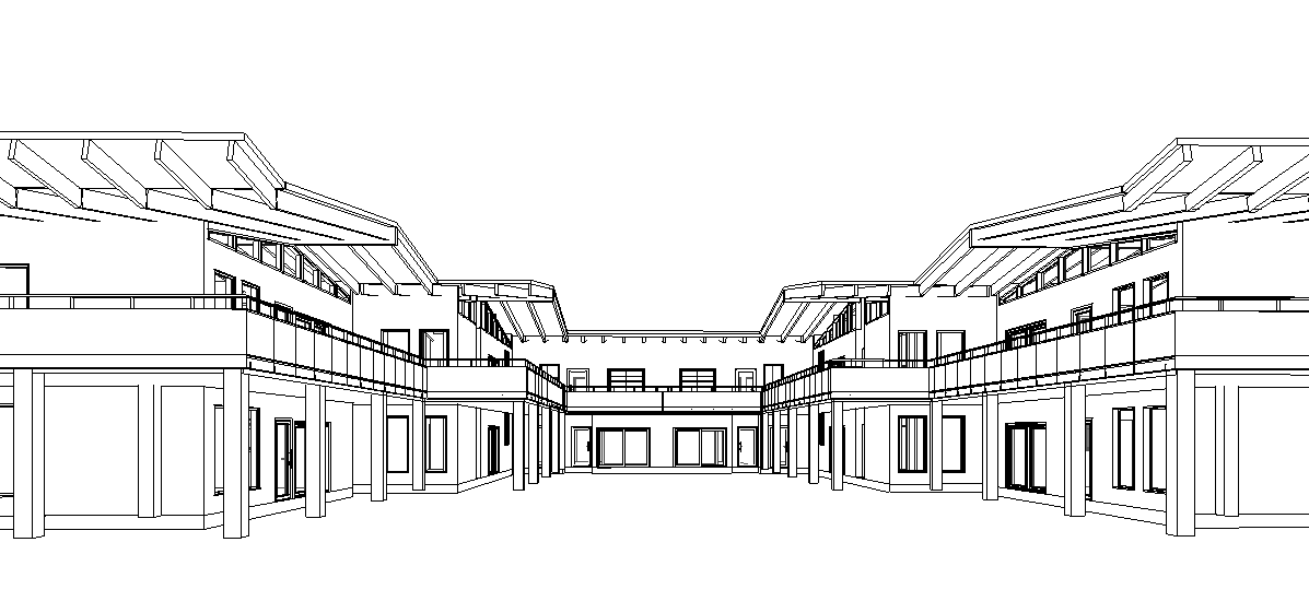 courtyard exterior render prompt exterior view from ground level inside the central courtyard of a two story timber residential building camera looking across the courtyard showing the building wrapping around on both sides building two story timber structure with exposed timber posts and beams timber cladding timber louvre screens on upper level black metal roof with overhangs upper level has balconies with timber railings ground floor has large glass sliding doors opening to courtyard small private decks warm natural timber tones throughout honey to medium brown courtyard layout following the plan large rectangular courtyard space approximately 25 30m long multiple zones with organic meandering pathways connecting them curved concrete pathways light grey weaving through the space several distinct garden zones with tree clusters mature native trees pohutukawa kowhai creating canopy and shade water features small naturalistic ponds streams with stone edges stepping stones across water large boulders and rock groupings placed naturally throughout dense native planting ferns grasses shrubs filling spaces between pathways small lawn pockets between planted areas raised planting beds with timber or stone edges garden seating timber benches under trees play elements subtly integrated natural climbing rocks log steppers very organic naturalistic landscape flowing forms not rigid geometry courtyard atmosphere feels like walking into a forest garden lush green intimate pockets of space connected by pathways not one big open lawn but multiple smaller zones you discover as you move through dense planting creates sense of nature taking over water features add sound and life people 6 8 residents casual everyday activities couple sitting on bench talking parent and child near water feature child looking at plants someone reading under tree person on their ground floor deck with coffee couple walking along pathway teenager sitting on steps natural poses comfortable clothing relaxed residential life lighting late afternoon golden hour 4 5pm warm sunlight filtering through tree canopy creating dappled light across courtyard soft shadows warm glow on timber building atmospheric slightly hazy peaceful quality style photorealistic warm natural tones lush greenery dominant soft lighting cozy residential atmosphere