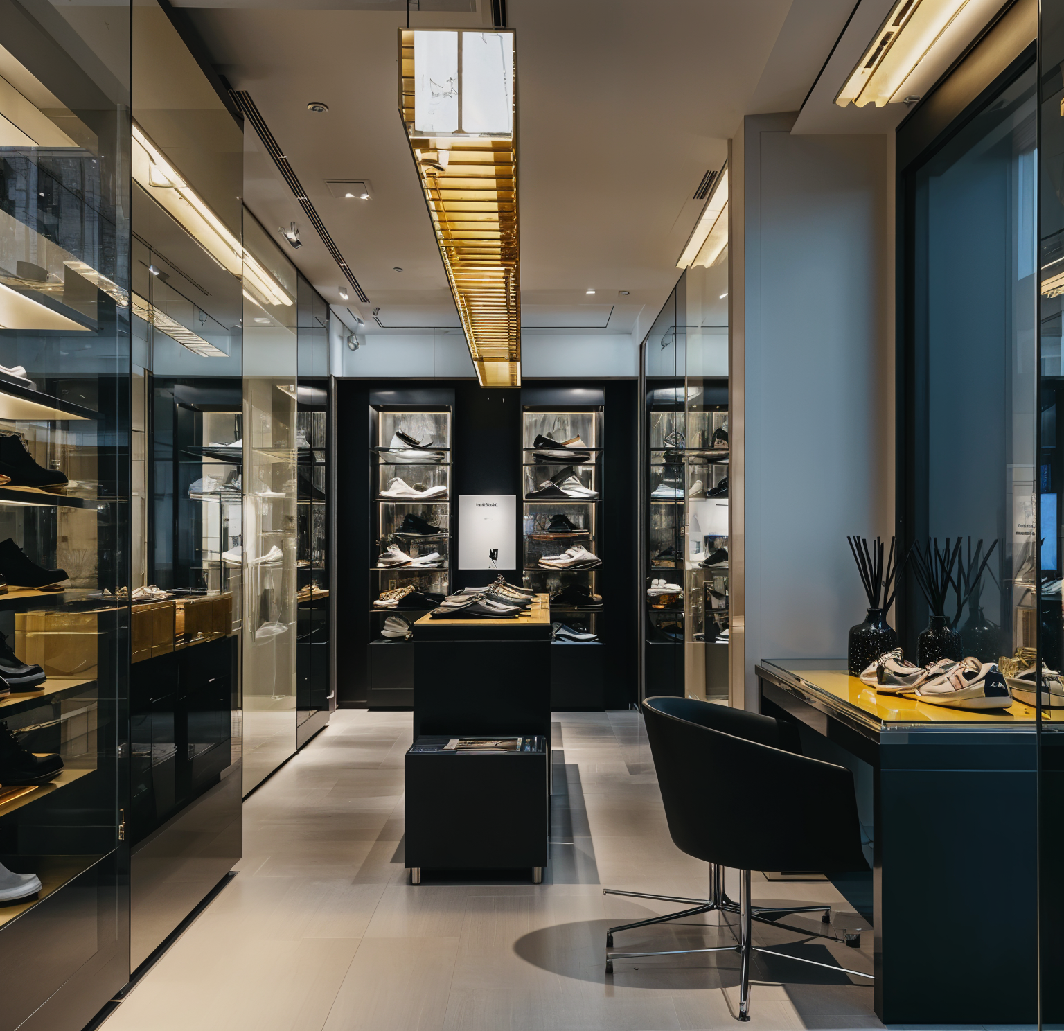 dressing area with illuminated shelving and a lit up mirror in a modern style architecture