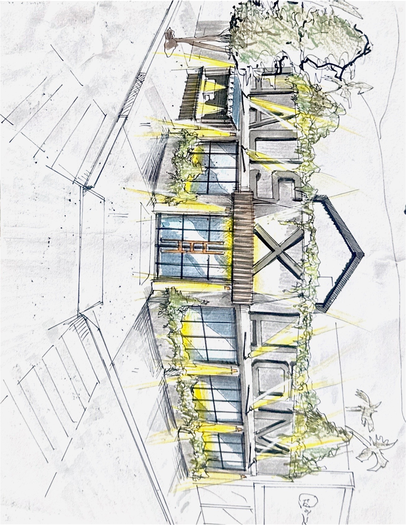 this is a rendering of a building from the street corner the exxterior should be painted black the image should be shot at dusk architecture