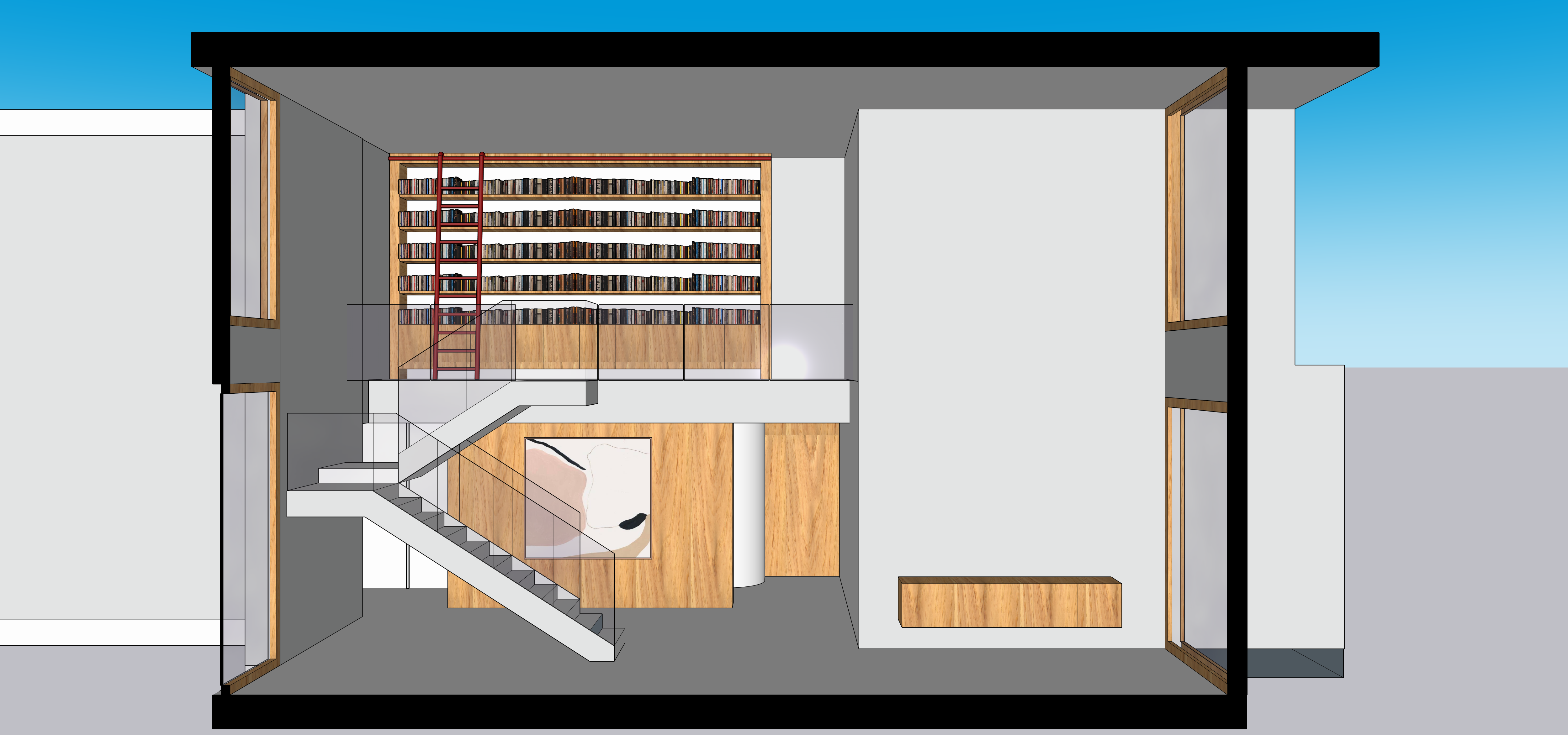 render this view architectural style render floors large light beige natural stone tiles add subtle lighting to the library on the second floor