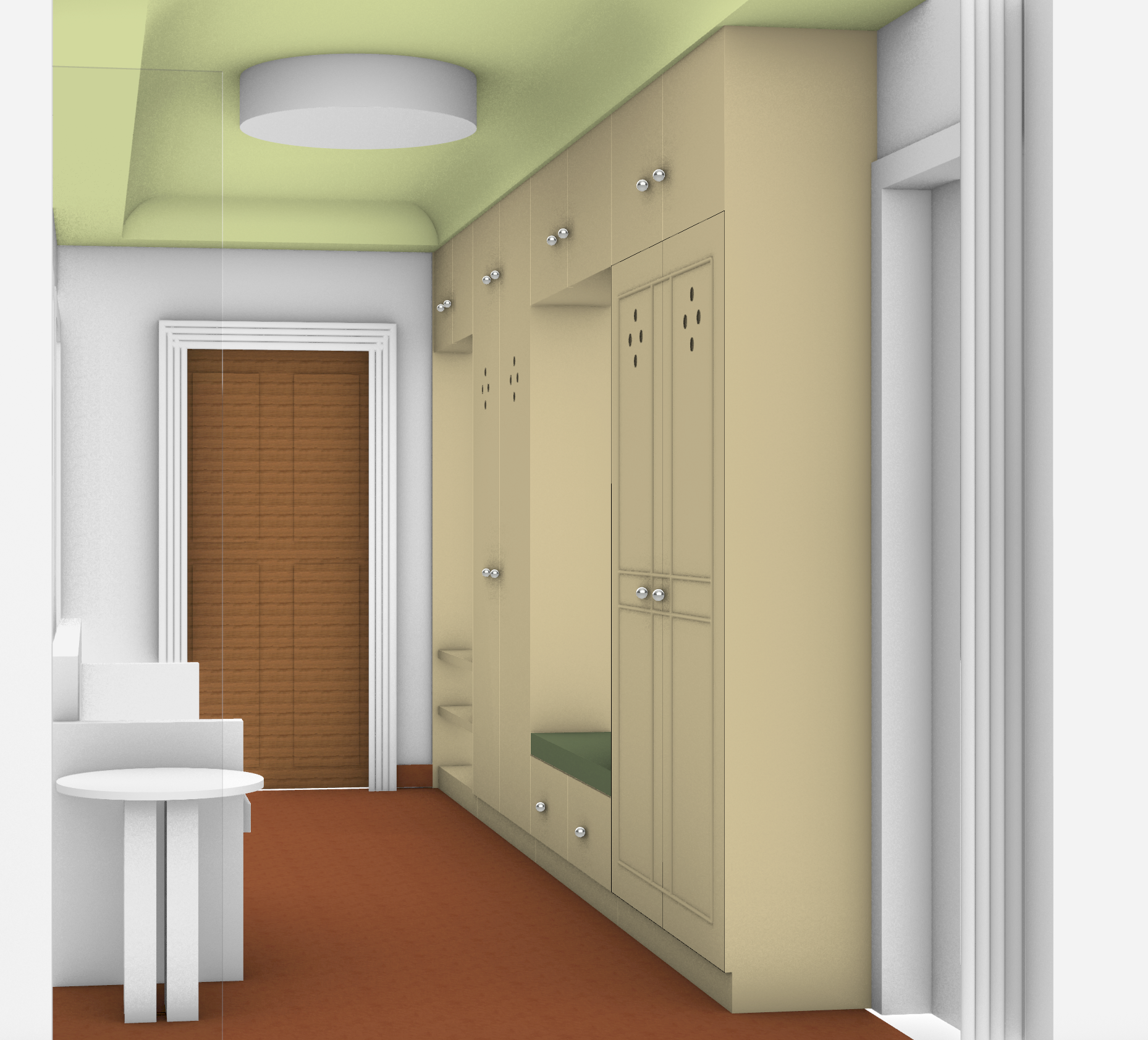 render this room in a romantic morning light comings in from the garden make the cabinets a lime green matching the ceiling above and replicate the detail on the first pair across all of them with an oak church pew on the left and red flowers on the table next to it make the floors a matte brown brick in a grid pattern