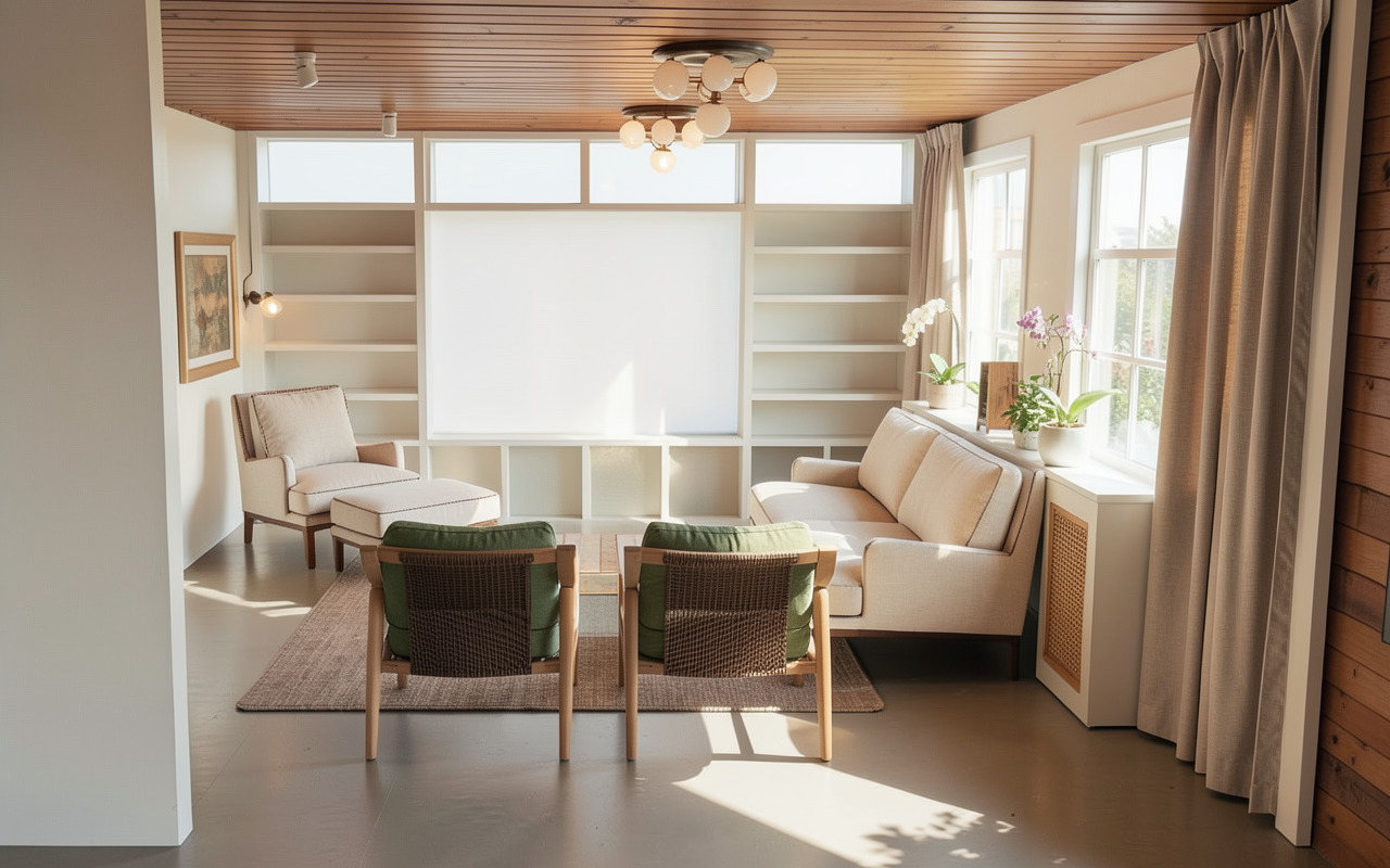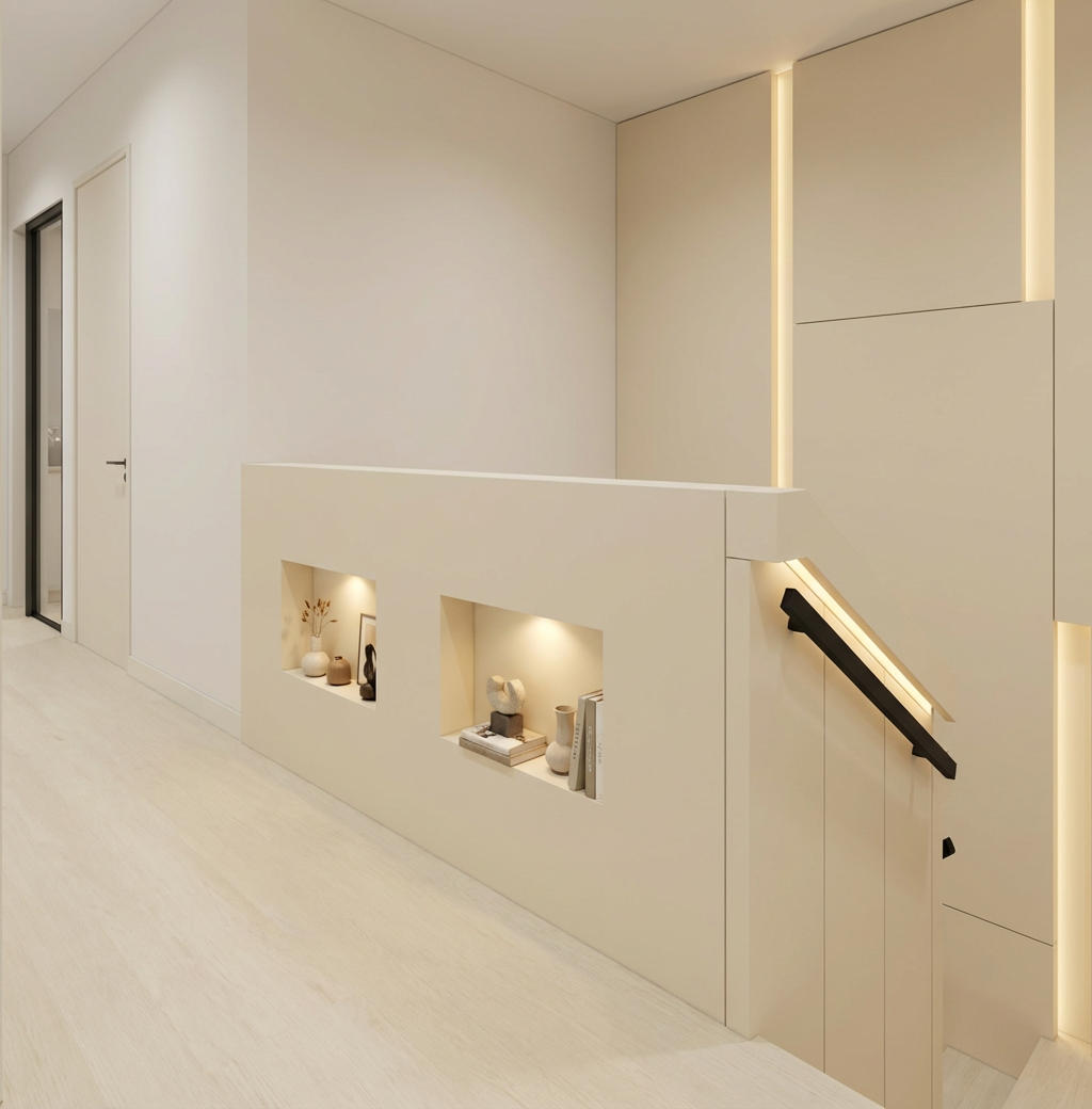 enhance this render into an ultra realistic high end interior visualization while keeping everything exactly the same do not change the design layout materials colors furniture lighting positions or camera angle this is a pure realism upgrade only improve the image with highly realistic material textures matte cabinetry stone surface fabric sofa wood flooring subtle imperfections and natural variation in all surfaces refined stone texture with soft depth and micro detail accurate matte finish on cabinetry no gloss added realistic wood grain on herringbone floor soft fabric folds and texture on sofa and cushions clean glass reflections on cabinet door lighting keep the same lighting setup and mood enhance with realistic light behavior soft falloff bounce light ambient occlusion maintain warm neutral tone 3000k 3500k improve shadow depth and realism without changing intensity rendering quality sharper details realistic reflections and highlights natural contrast not overprocessed high end architectural photography look negative prompt do not change design do not change colors do not change materials do not change stone do not change cabinetry color do not move anything do not add decor no redesign no color shift no glossy surfaces no lighting change no composition change no extra elements