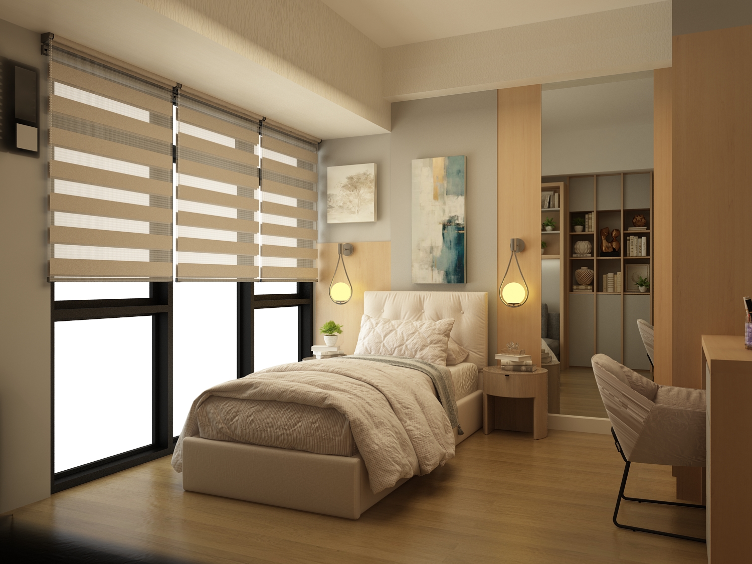 maintain details add a few trees outside the window retain blinds pillows light pink and white comforter white and gray