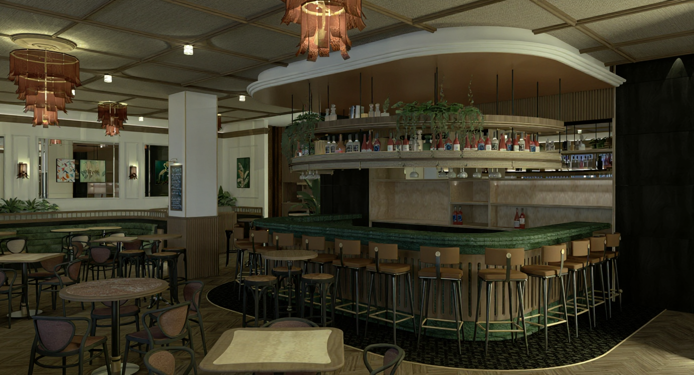 exterior shot add some life to the visual like few people on terraces flower pots and similar architecture