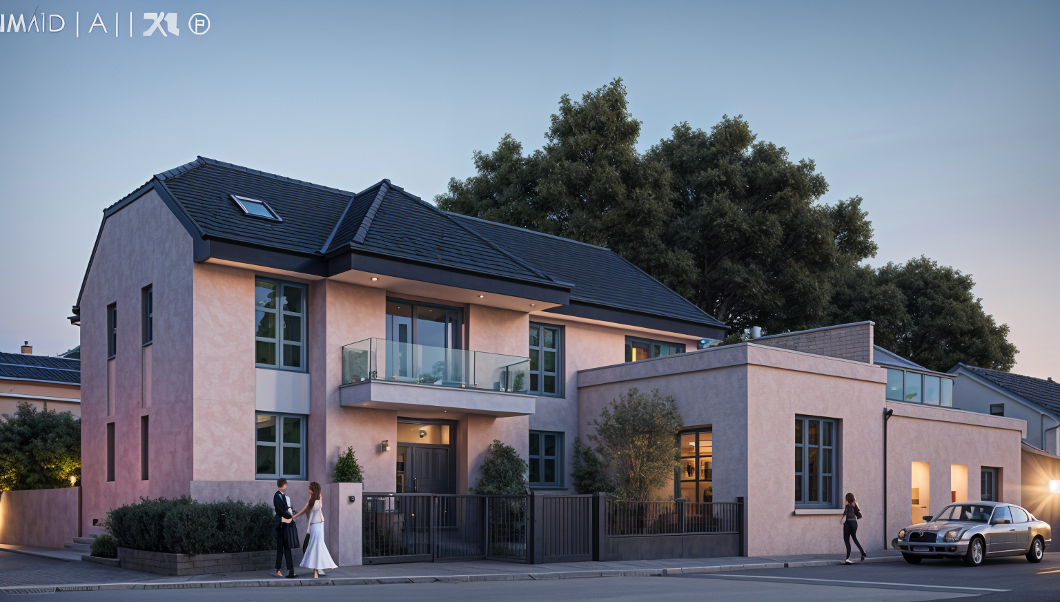 make the new annex building just visible through the trees more photorealistic corrugated metal grey roof dark grey vertical timber cladding with feature dormer in corten steel