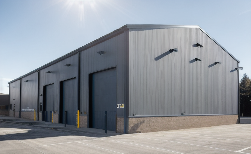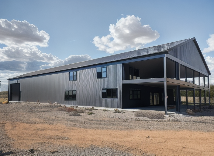 metal building home with burnished slate grey metal walls and black doors and black trim surrounded by dirt and a bright blue sky architecture