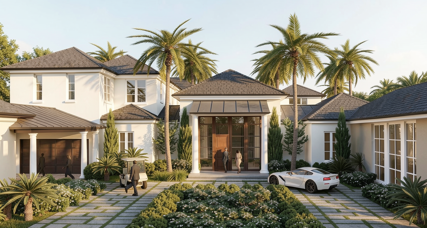 black roof white windows white vertical board and batten siding black metal rails on the deck white siding
