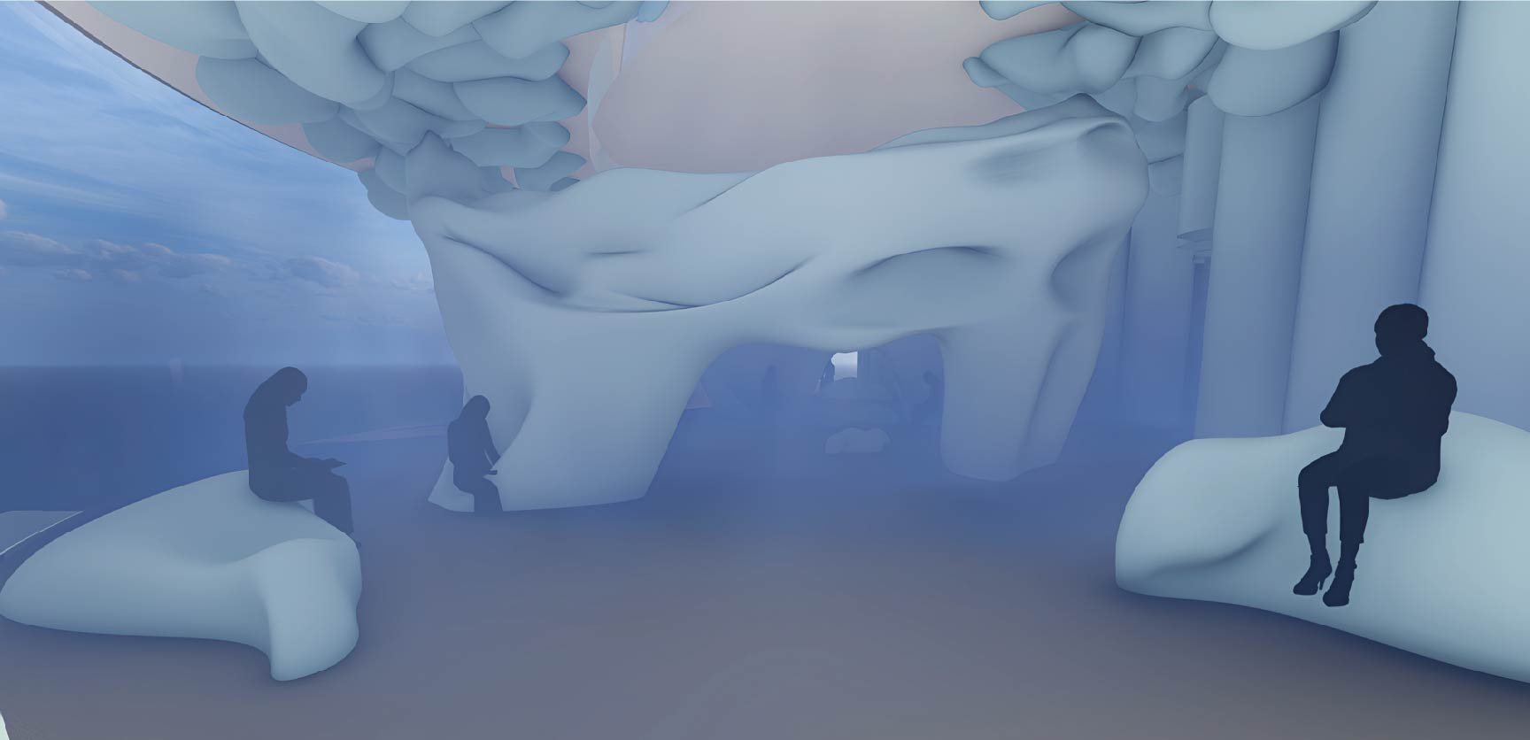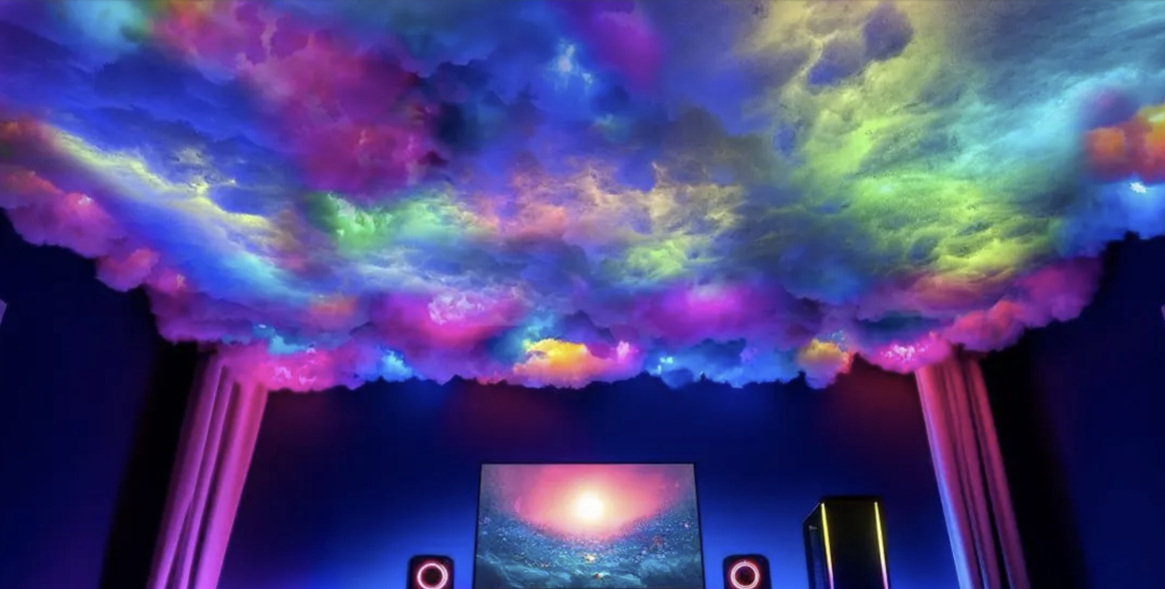 exterior shot render a full cloud room that imitates rejuvenation and relaxation in a cloud like atmospheric room use the reference image to create a milti color l e d lit cloud ceiling