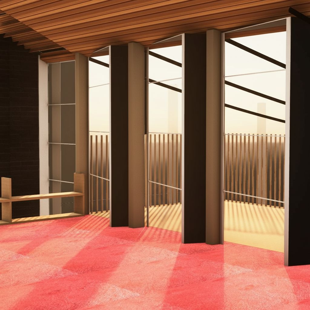 make a warm style image add sunrise behind glass doors maintain existing colours and textures make glass panes in doors a textured glass with circular pattens