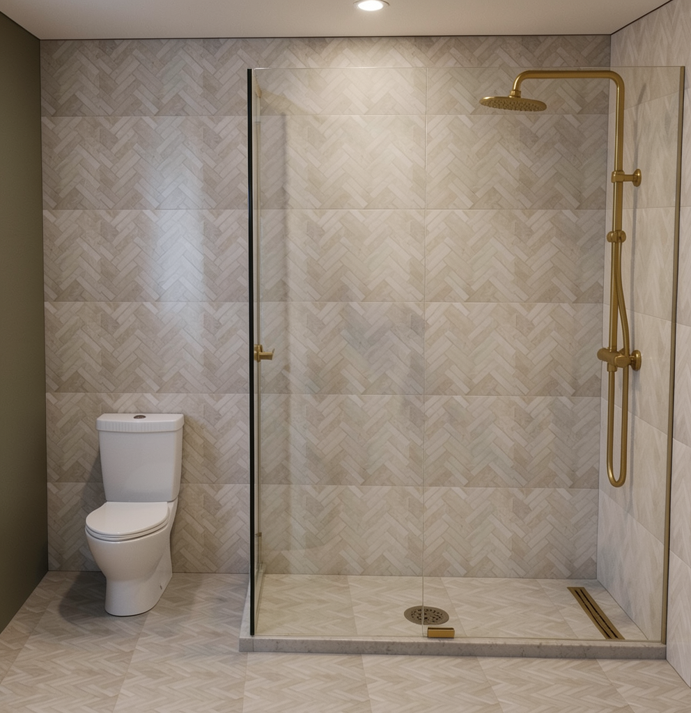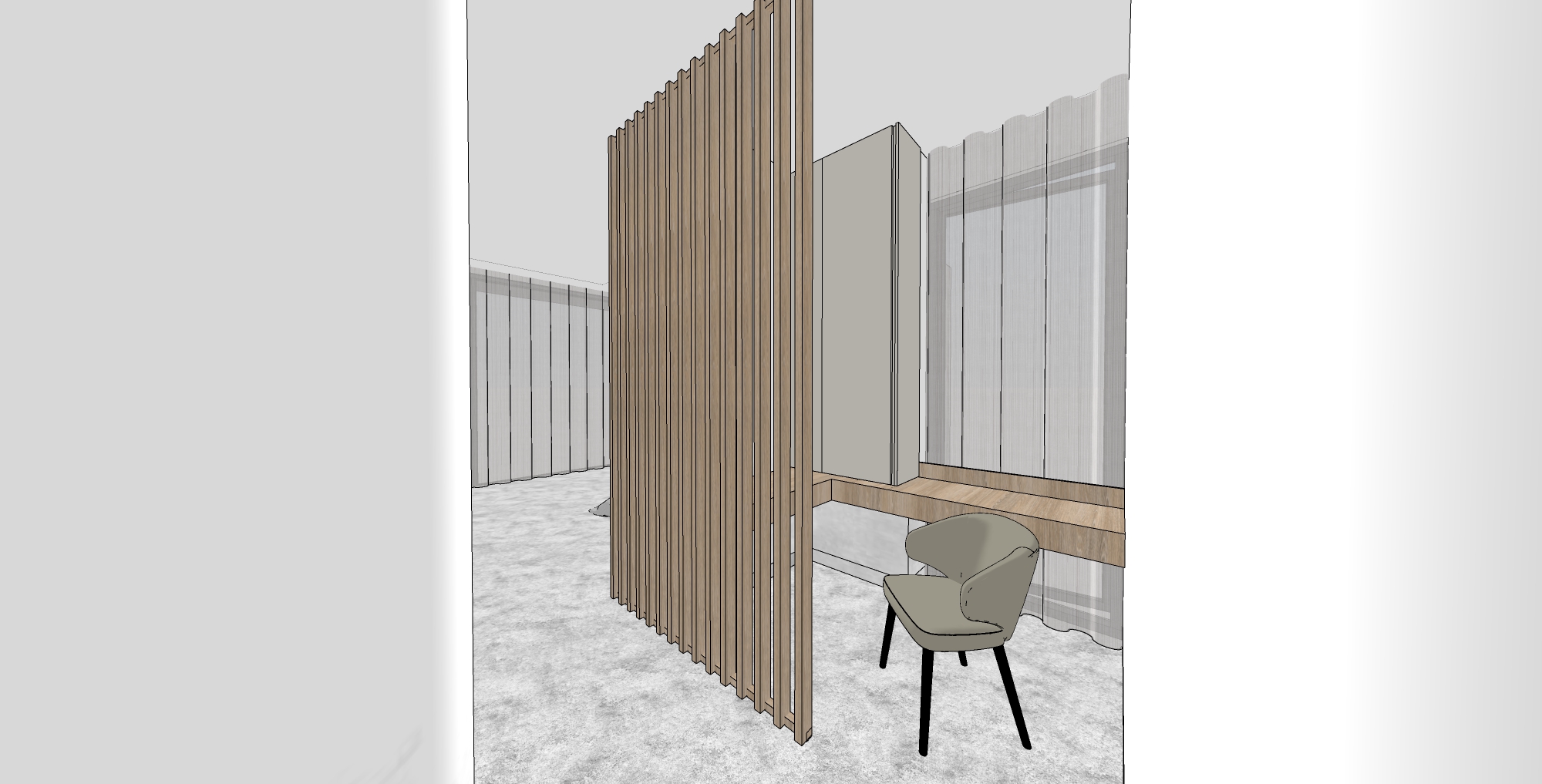 create a serene modern interior space with a minimalist design the partition wall consists of vertical slats made of dark walnut wood offering a natural touch the walls are smooth with curved corners with a muted matte texture soft warm gray colour the floor is polished concrete a sleek modern chair with an olive green cushion and black legs complements the space ambient lighting adds a gentle inviting glow creating a tranquil and sophisticated atmosphere bright natural light comes into the room via sheer curtains in the background and on the right hand side create a bright and light interior