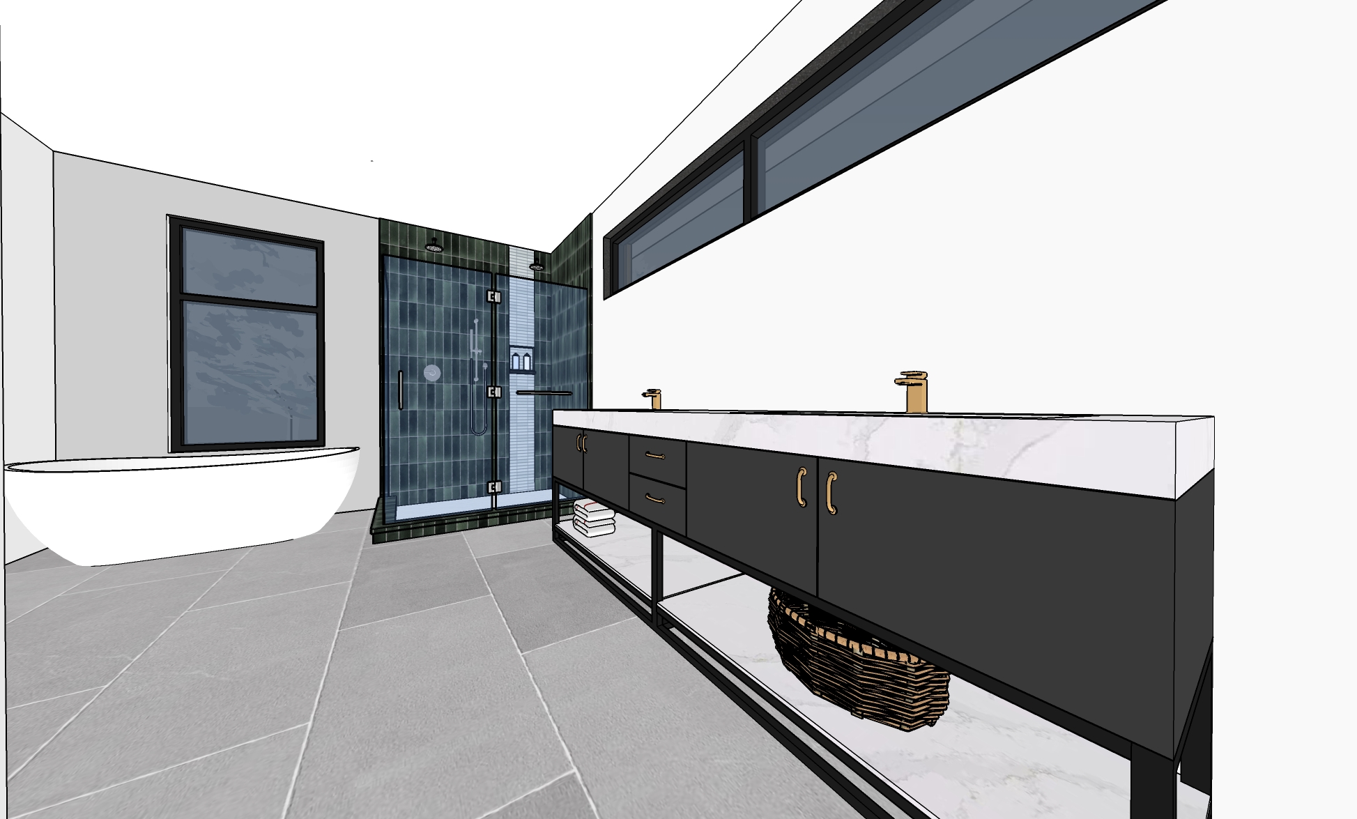 render image to look realistic add light fixtures make space look manly forest behind glass at mirrors add vanity wall add pendant above tub