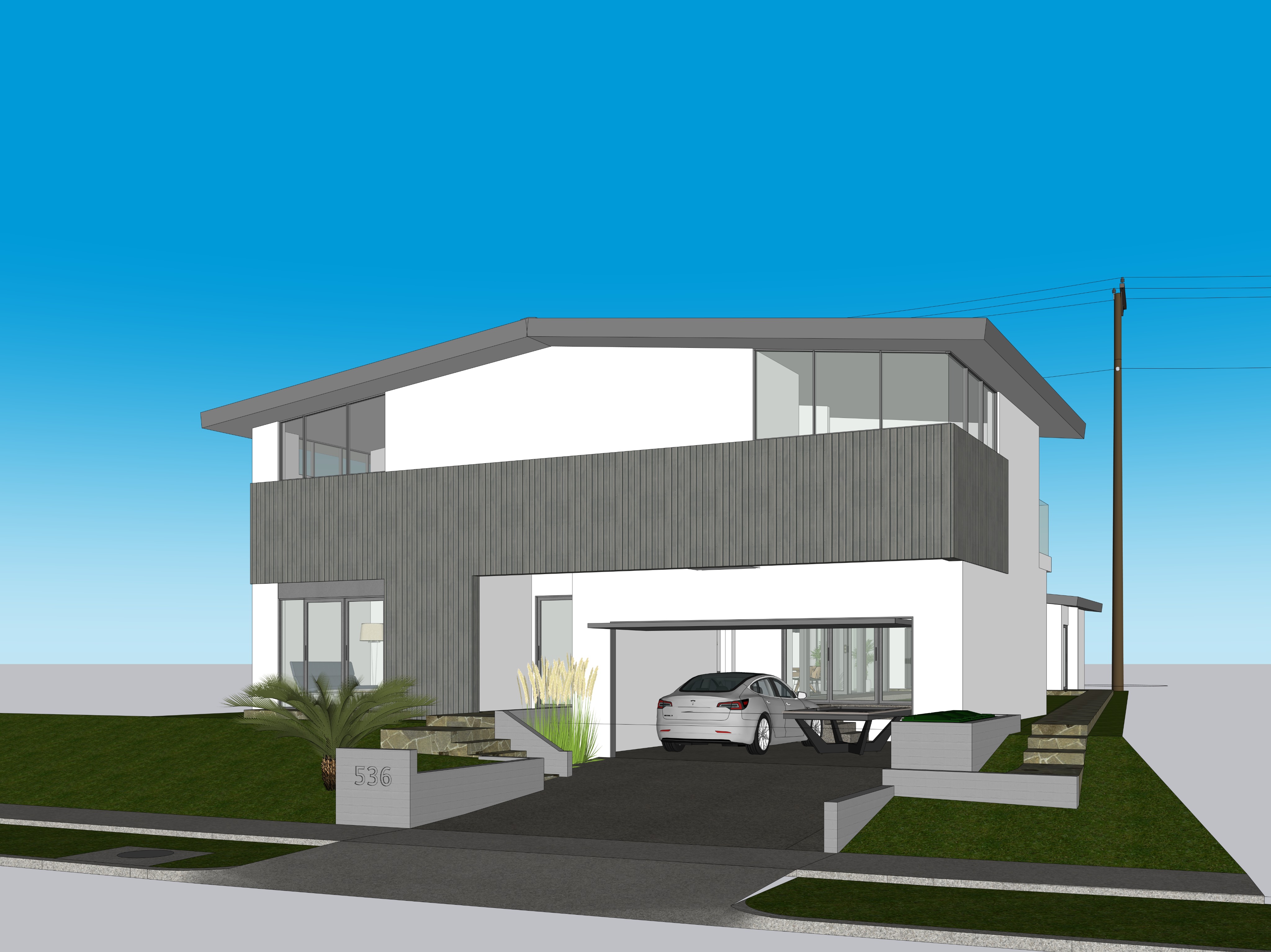 evening view lights on inside the house add california wild grasses and flowers to the landscape add grass in the the yard space enhance the glazing materials add some palms and trees adjacent to the house on the left and right sides of the view add some lights in the planting areas use the perspective view from the source image