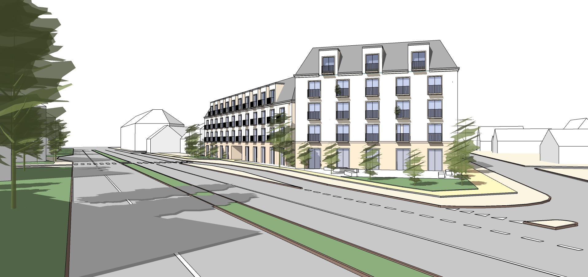 nordic exterior shot keep render as close to original as posible nordic light light in some of the windows it is a brick building architecture