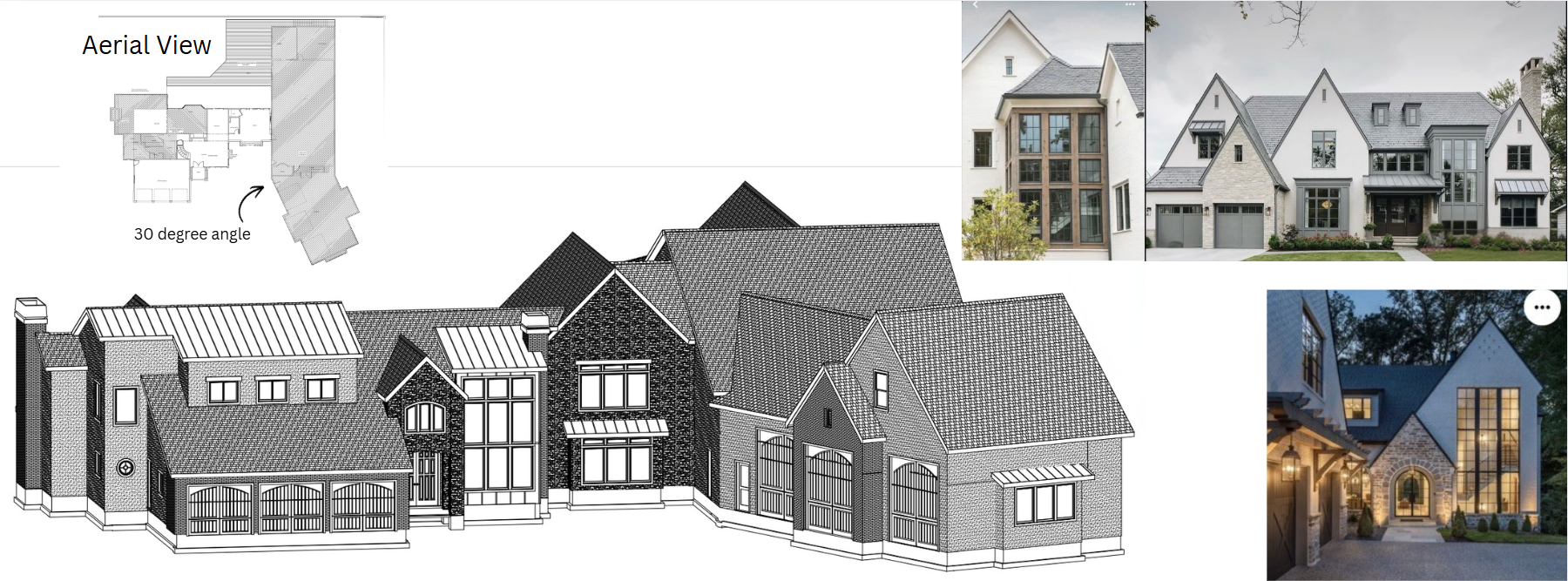 render a 3 d realistic image do not change the layout or structure maintain the 30 degree angle keep all windows doors and garage doors as they are implement the elements coloring from the inspo pictures into the raw drawing
