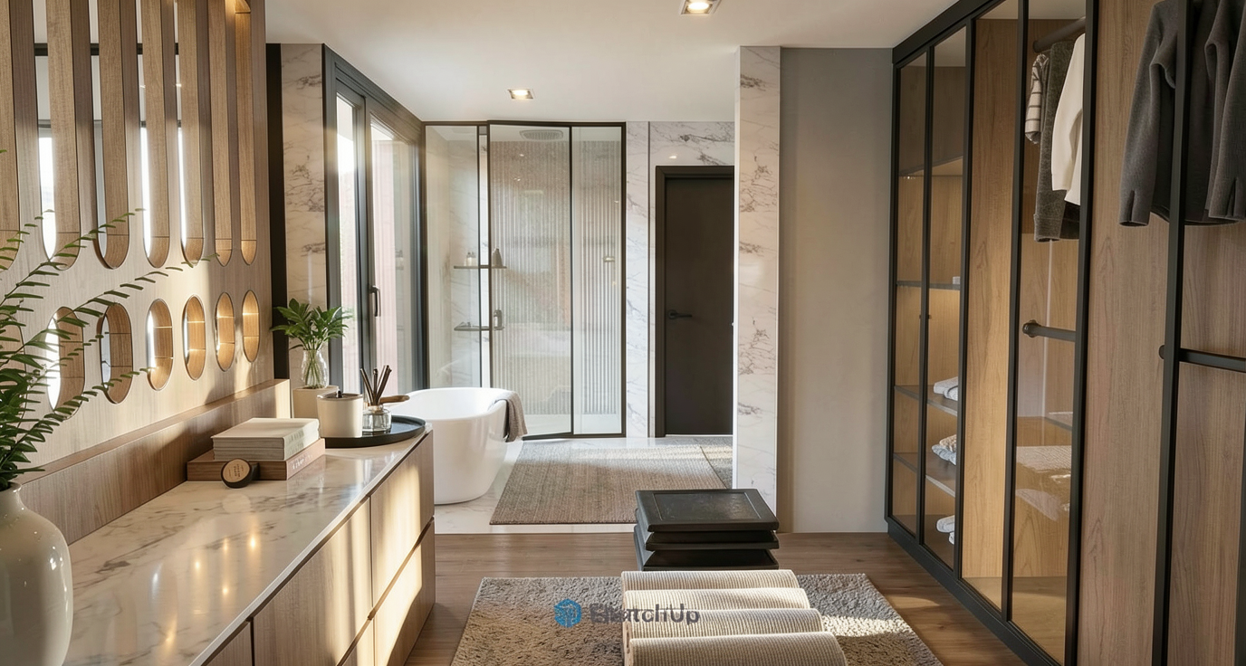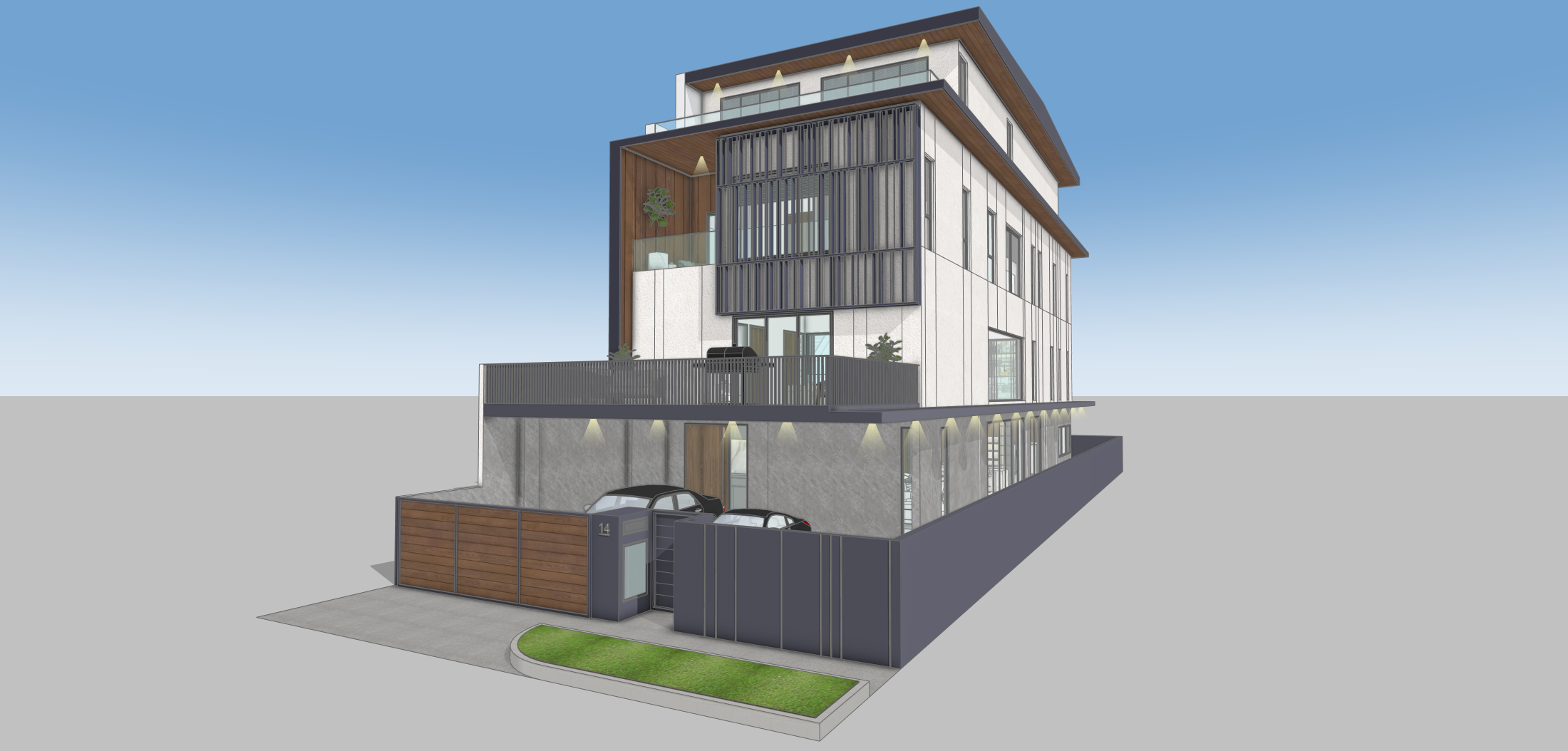 ultra realistic contemporary residential building 8k resolution three storey modern house with rooftop terrace minimalist luxury architecture exterior features white stone cladding exposed fair faced concrete and warm natural wood soffits and wall panels prominent vertical metal louvers in dark charcoal finish on the upper fa ade providing sun shading and privacy large floor to ceiling glass windows with subtle reflections and realistic interior depth ground level includes a semi basement garage with two parked modern cars dark matte metal perimeter fencing and wooden sliding gate with modern house number signage soft warm recessed led wall lighting integrated along the fa ade and retaining walls creating realistic night ready architectural illumination even in daylight upper floors include cantilevered balconies glass balustrades potted greenery and a rooftop terrace with planters clean urban streetscape minimal landscaping with trimmed grass patch and concrete curb neutral city background uncluttered environment day sky vibrant colours with clouds