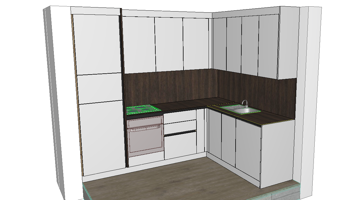 ultra realistic render of a modern small l shaped kitchen interior originally modeled in archicad the cabinets are glossy white with smooth reflective finish clean modern minimalist design the countertop remains natural dark wood texture exactly as in the model with realistic wood grain and matte finish matching wooden backsplash behind the counter built in oven cooktop and sink are aligned and professionally installed with realistic stainless steel materials soft under cabinet led lighting illuminating the wooden countertop natural daylight coming from the side creating soft shadows and reflections on the glossy white cabinets high quality materials realistic textures global illumination ambient occlusion depth of field professional interior photography style ultra photorealistic 4k render realistic reflections not looking like a 3d model or archicad drawing