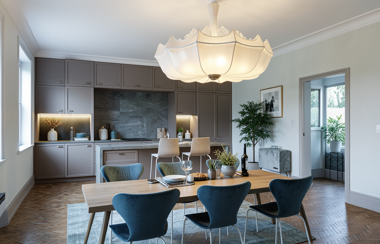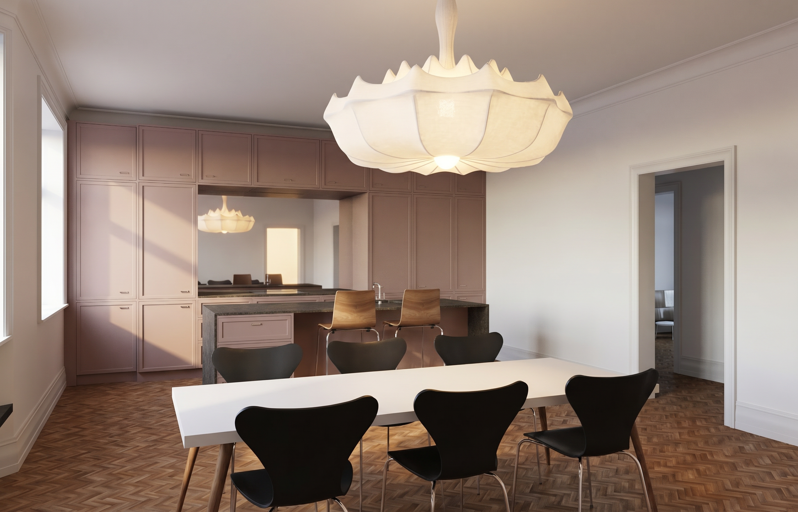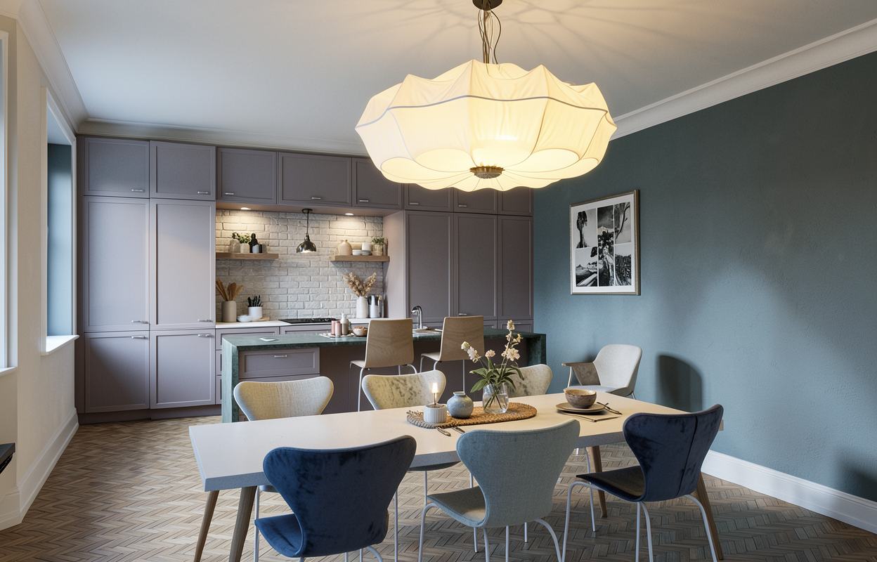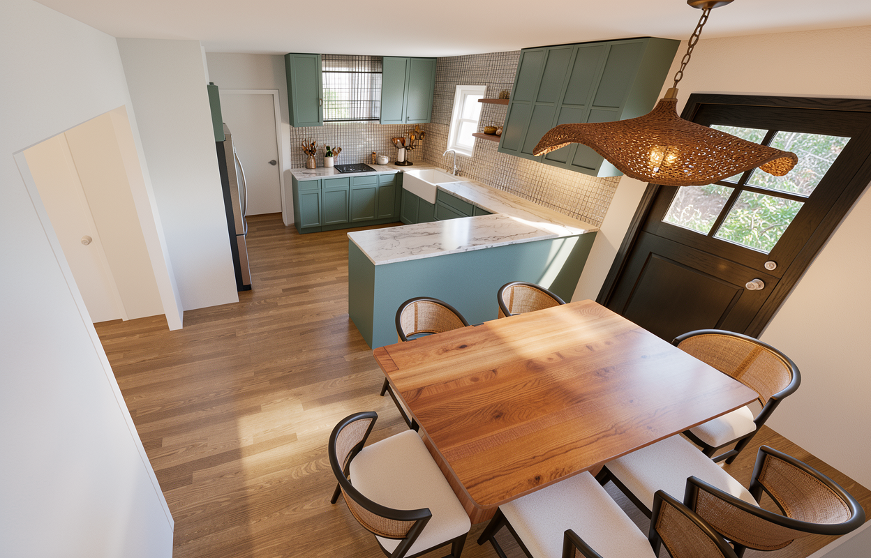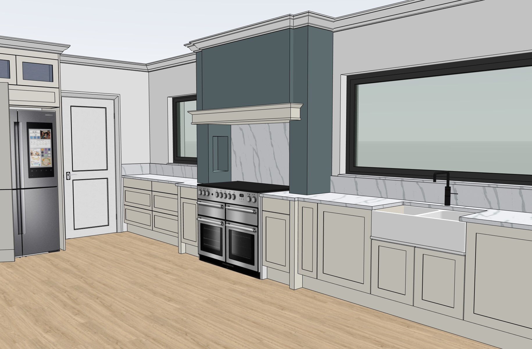 realistic kitchen render for client put knobs on doors drawers fronts put landscape or fields outside the window