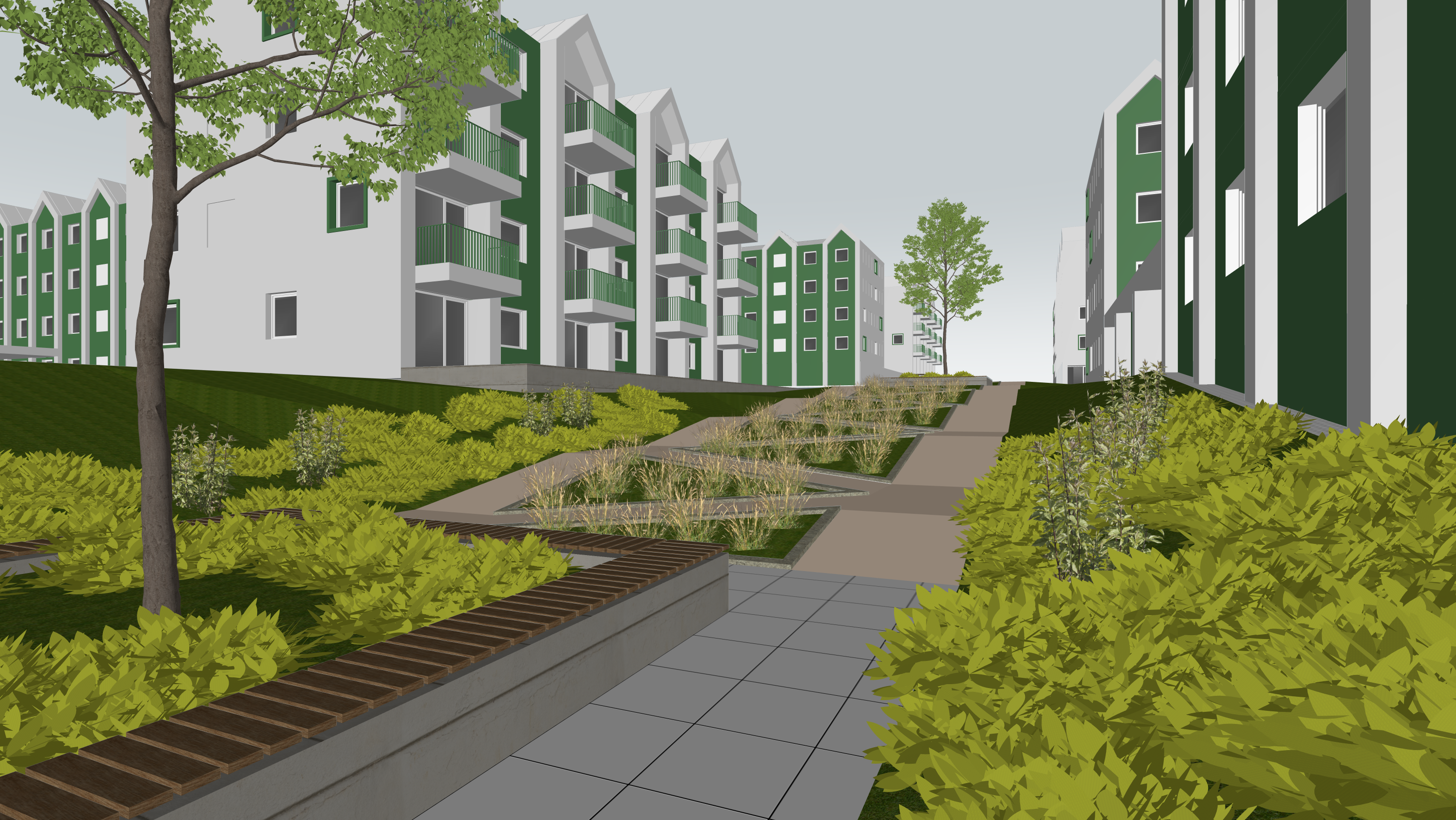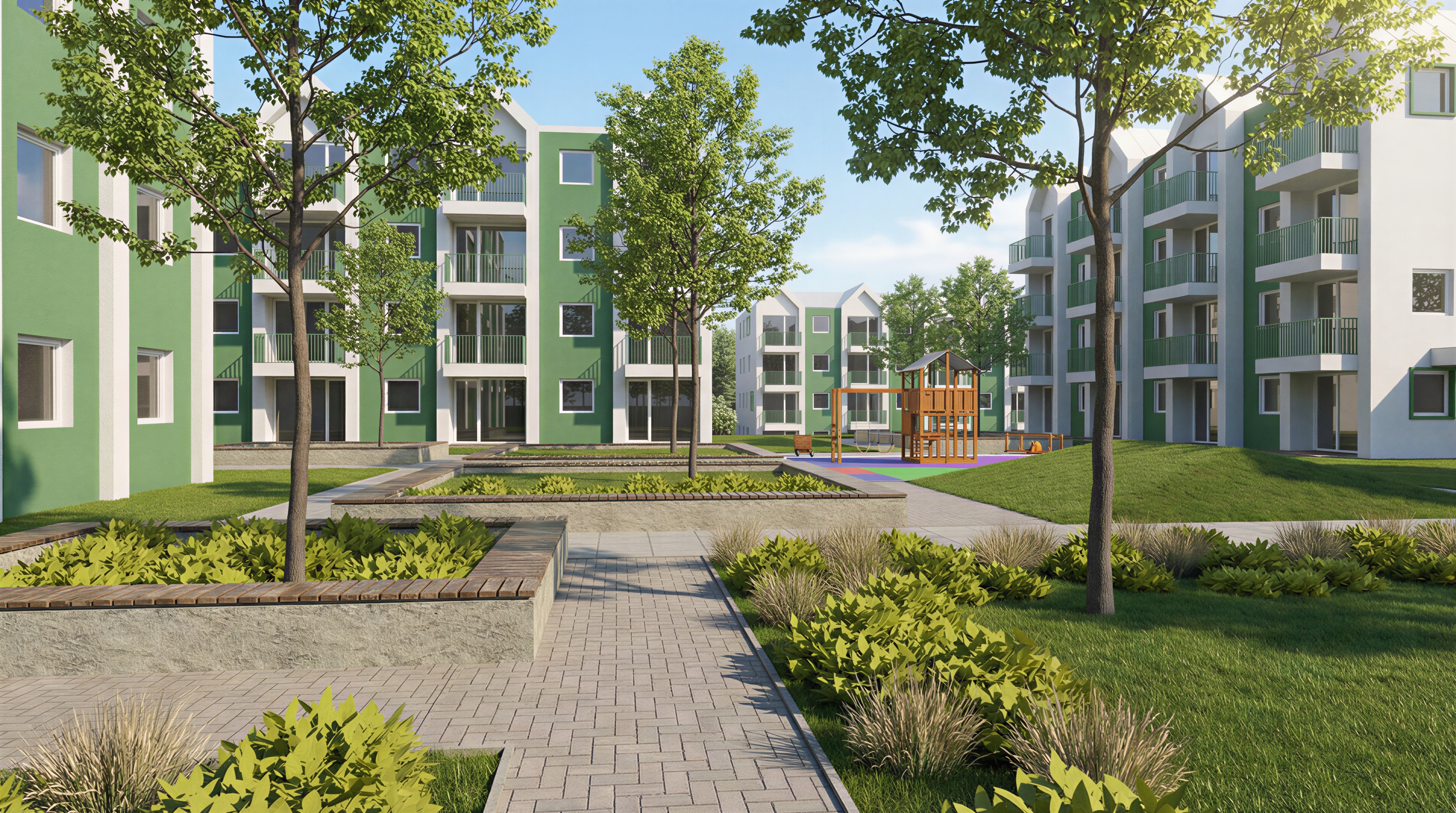 exterior shot render a serene urban landscape featuring modern minimalist apartment buildings with white and forest green accents the buildings should have a clean geometric design with balconies and large windows surrounding the buildings are lush vibrant green bushes and neatly arranged patches of ornamental grass the pathway is a soft light gray with evenly spaced tiles leading through a bright and inviting atmosphere the trees are tall with full leafy canopies in fresh green the scene is bathed in soft daylight creating a calm and pleasant environment