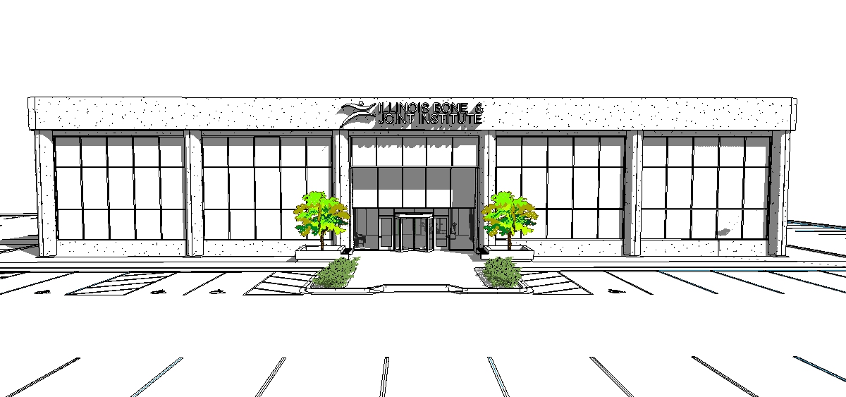 a modern two story office building featuring a long facade dominated by large reflective glass windows and dark aluminum mullions the prominent round with vertical grooves columns with fairfaced concrete finish flat roof parapet with fairfaced concrete flanked by colorful flowers brighten up the image the structure is set against a vibrant blue sky and surrounded by lush green grass and autumnal trees displaying vivid red and orange foliage the atmosphere is clear and sunny with bright light illuminating the scene and casting soft shadows across the expansive very black asphalt parking area where a few cars are parked and pedestrians are walking to make the seen lively signage of illinois bone joint institute at the top center of building entry with led light at its back of the signage raised planter with red tree on both sides area of entry full the sunk in green area on entry plaza with colorful flowers