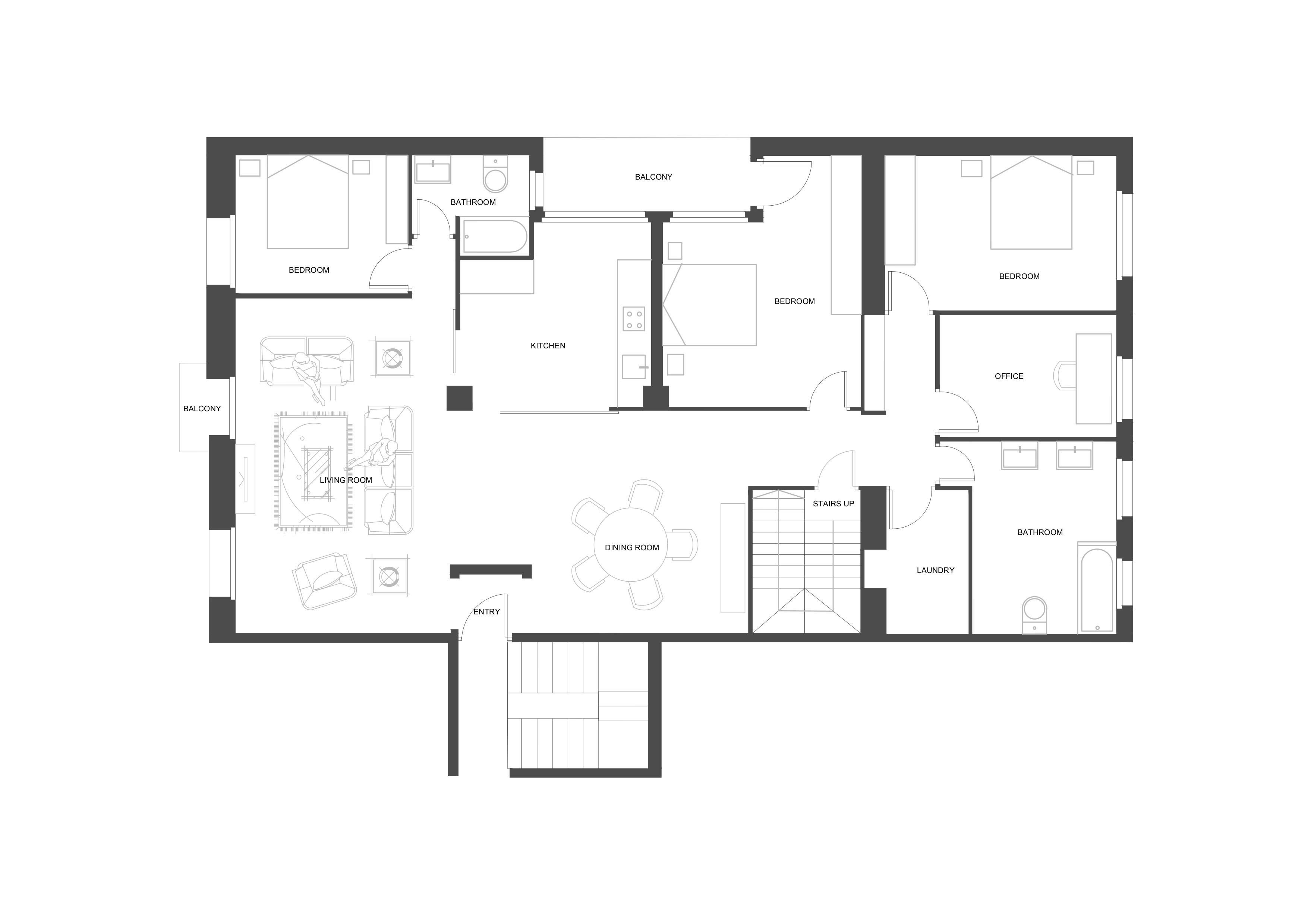 convert this floor plan into a realistic isometric 3d view of a full house show the space from an elevated angle with furniture walls and details visible all floors to be natural oak wood walls in white color i want scandinavian style for all furniture and rugs the kitchen is white and the access to the kitchen in the front and left rigth side are booth glass sliding doors in black metal frame the kitchen has access with a sliding door to the back balcony add all funriture you consider to look full and beautiful ready carefully where are going every door and window and keep them as shown in teh plans do not add new windows and do not made them bigger use the same furniture as shows on the plan do not change the orientation of the floorplan