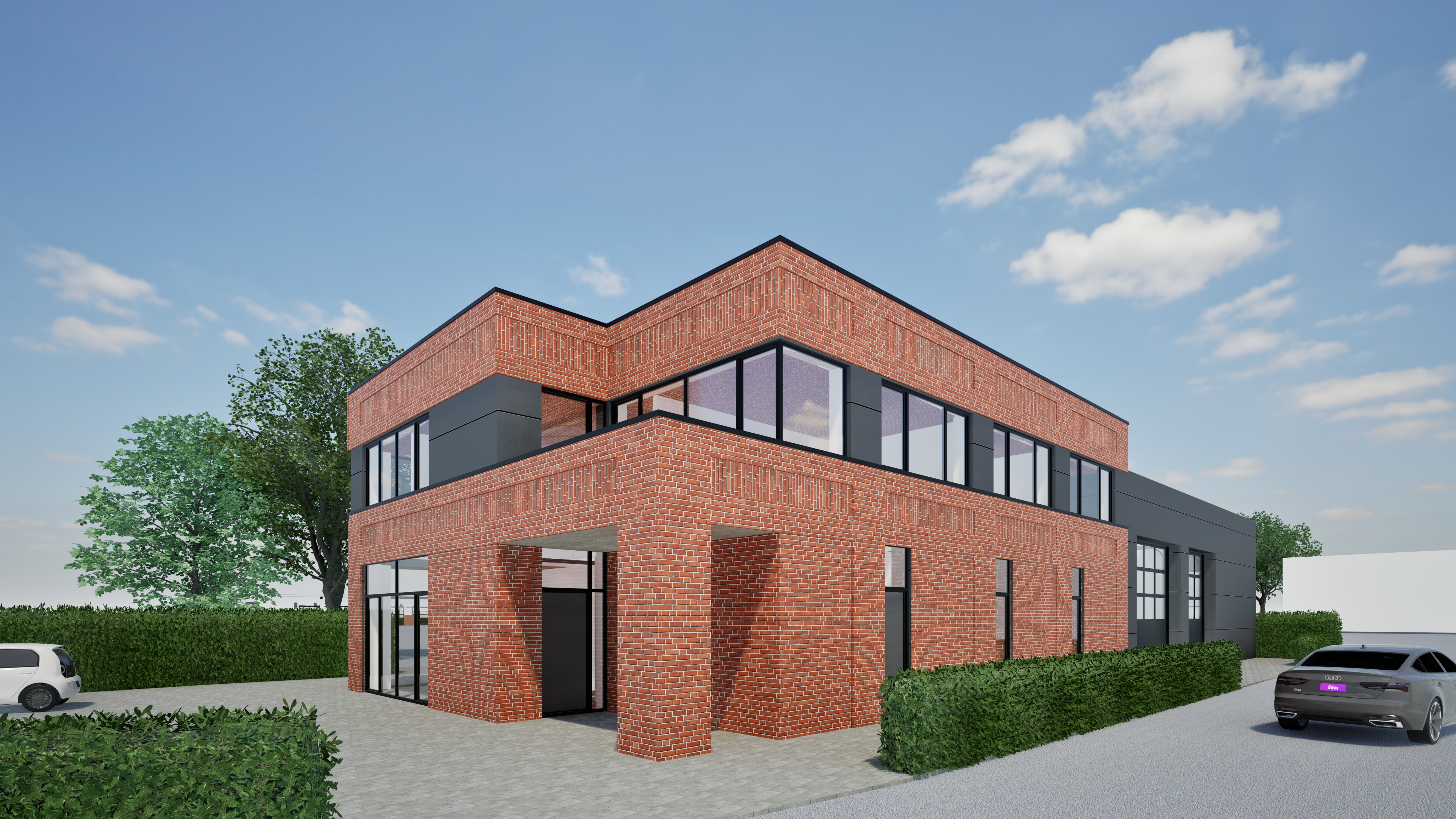 transform this rendering into an ultra photorealistic architectural photograph shot in summer bright atmospherical light preserve exact geometry materials colors and composition from the original image enhance only real world material behavior natural reflections roughness variation subtle imperfections apply physically accurate daylight soft shadows realistic global illumination professional architectural photography look 35 50 mm lens straight verticals natural exposure no cgi look indistinguishable from a real photo korregiere leichte fehler im rendering und stelle die klinkertexturen nahtlos dar erg nze realistisches glas durch das man etwas innenraum erkennen kann stra e mir fu g ngerweg und boardsteinabsenkung zwischen den hecken die graue fassade antrazith dunkel fensterrahmen schwarz klinker hochaufl sned klare fugen und scharfe kanten zwischen klinker und fuge decke im obergeschoss innen wei blechfassade etwas gl nzender w nde im inneren alle wei kein mauerwekr hinter den fenster der ganze innen raum wei unten links wei e wand hjinter den fenstern natural lighting atmosphereic soft shadows realistic glasstexture innenraum erkennbar b ro