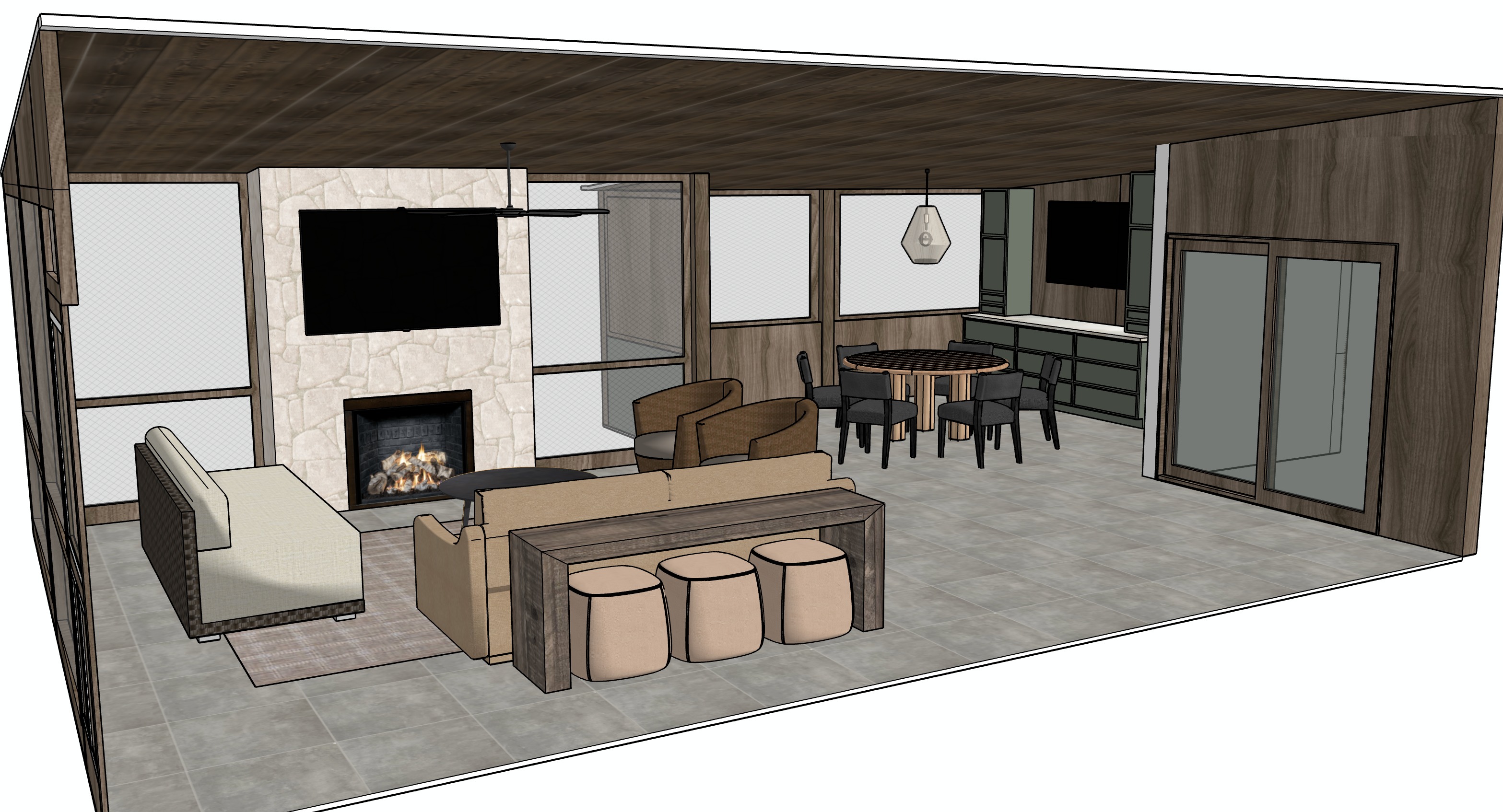 this is a screened in porch area make the screens realistic make the stonework on the fireplace a white light natural stone add some outdoor backyard scenery outside the space through the screens and natural daylight coming in the screens
