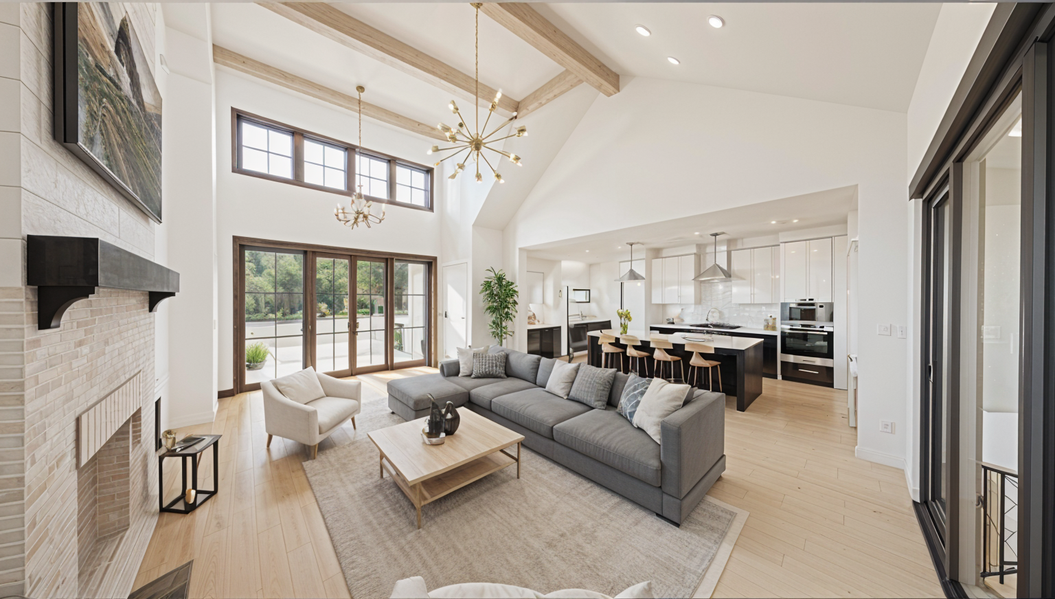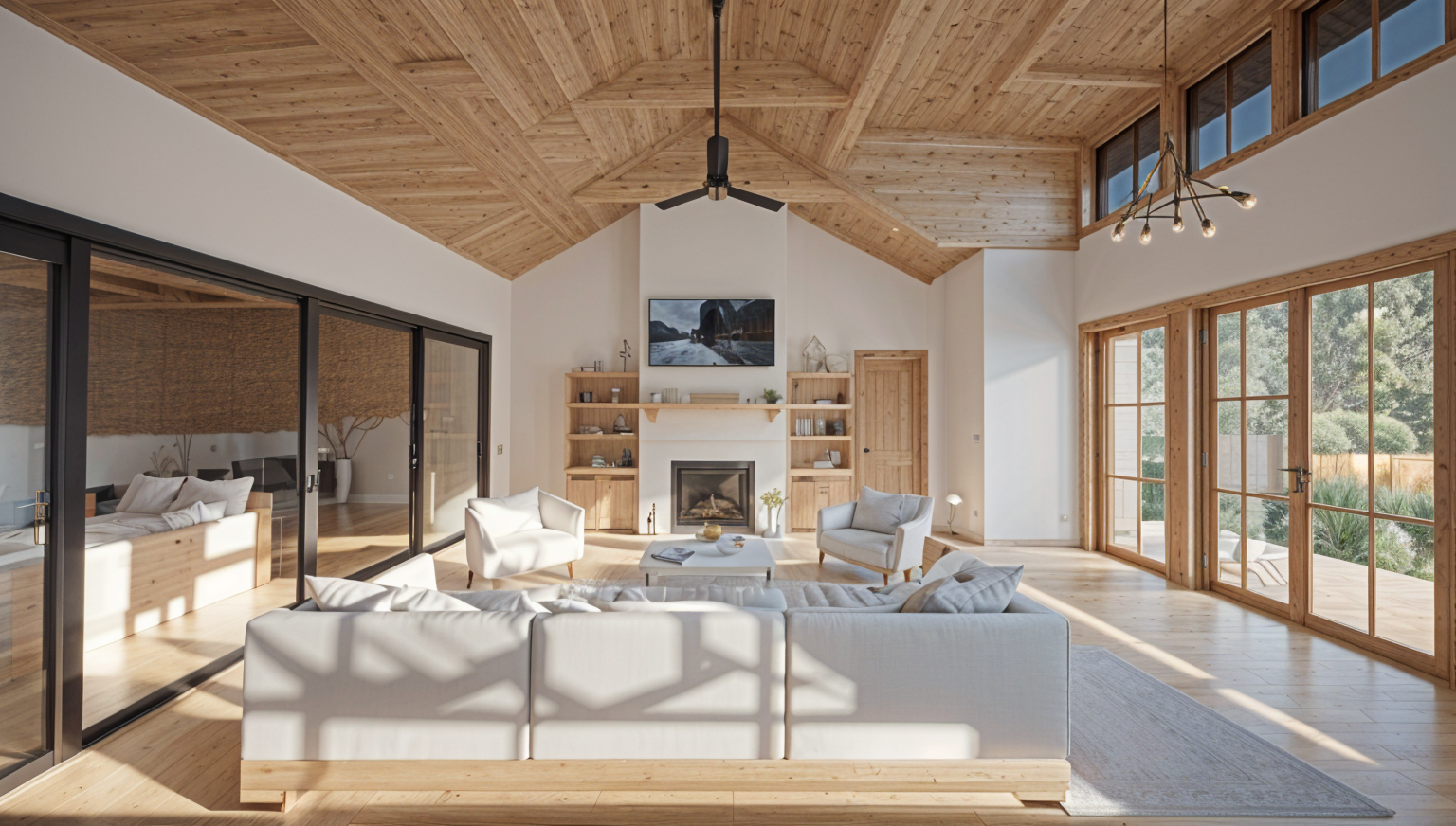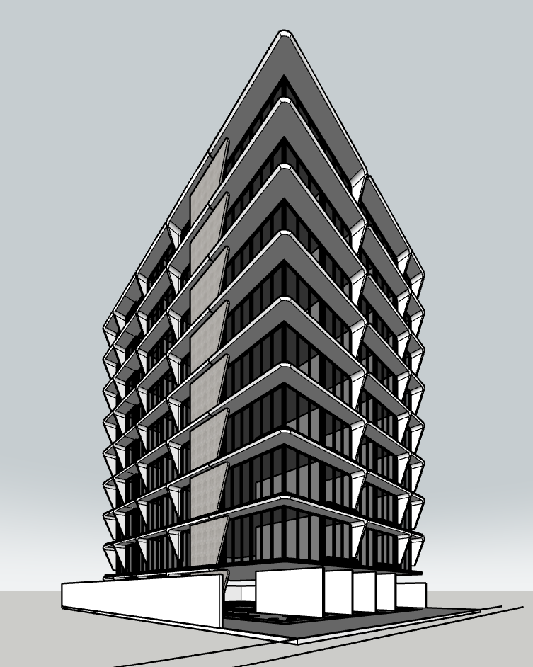 render a modernist architectural building with sleek angular lines use a palette of light gray for the concrete deep charcoal for the window frames and reflective glass the building should stand in an urban landscape with a clear blue sky and warm sunlight to create a bright and inviting atmosphere add subtle shadows for depth and dimension highlighting the building s geometric design