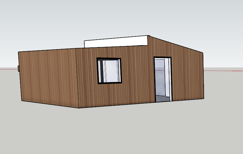 modernist exterior shot change wood cladding to a withe plaster render keep the doors and windows frame black install some lights to the wall outside up and down lights architecture