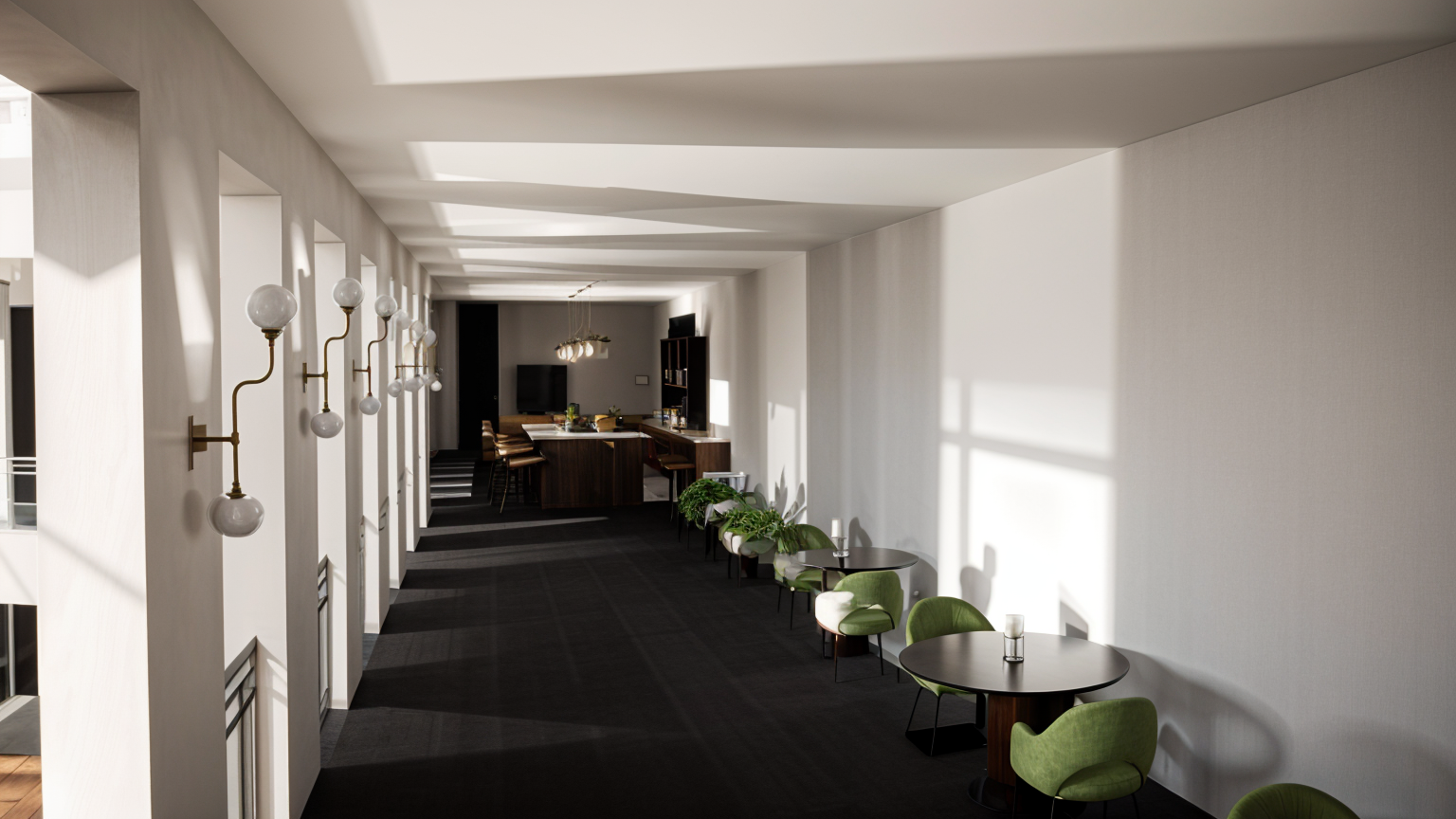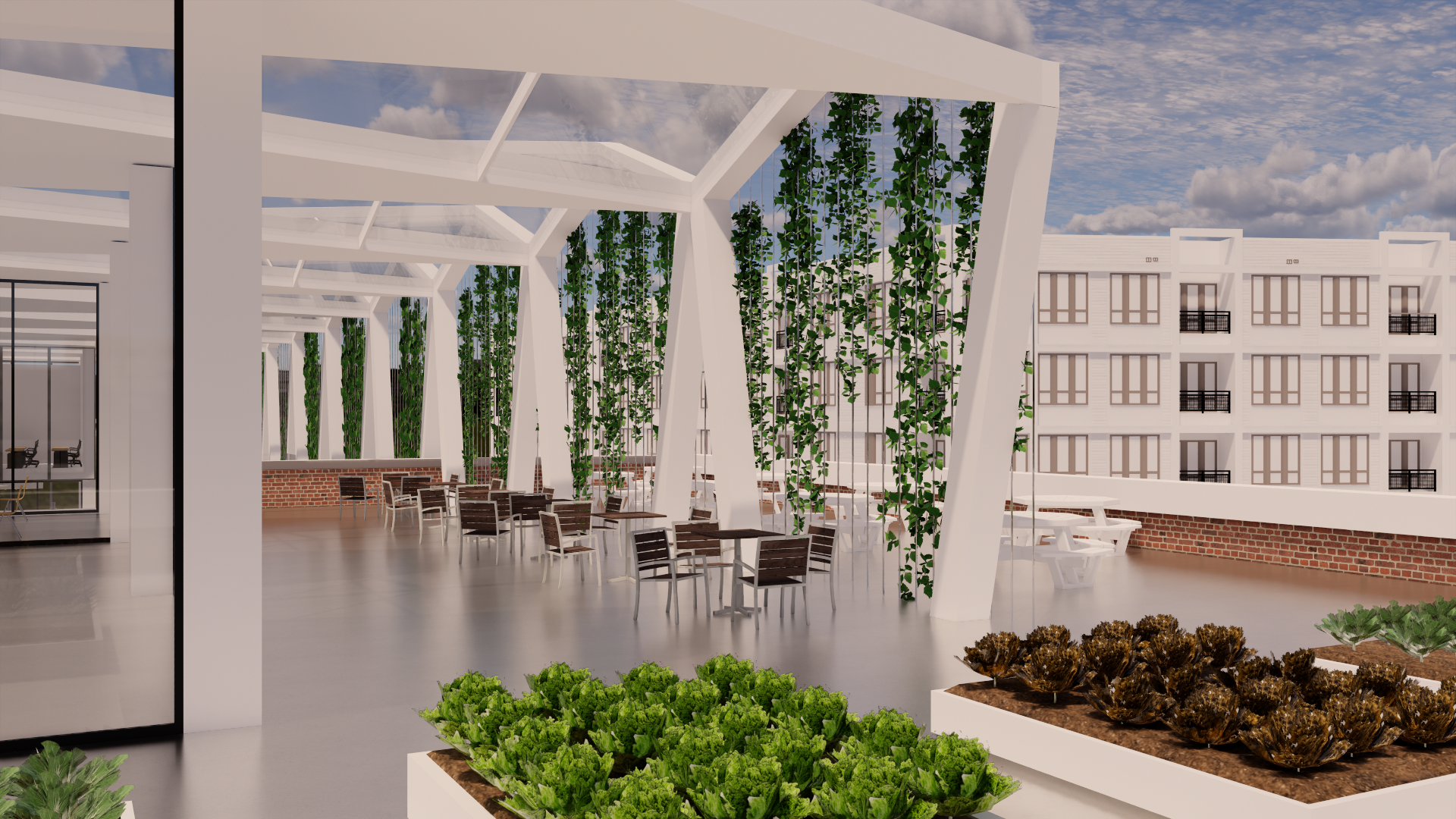 do not change any architecture geometry proportions framing camera angle planter locations table positions vine locations cable positions railing heights or the white structural shapes the spatial layout must remain exactly the same background building 451 calvert ave keep the updated red and dark gray apartment building but refine it to look fully realistic true to material cladding texture red panels charcoal framing correct window reflections realistic balcony railings proper depth shading and fa ade variation do not alter the massing or window alignments only improve realism white structural frames keep them exactly as modeled enhance realism using subtle cast in place concrete texture matte non reflective finish soft natural shadows do not change edges thickness or alignment vines steel cables keep every vine column and cable in the same place but increase variety and realism mix of different vine species varied density leaf shapes and sizes some fuller some sparser visible slightly reflective steel cables natural irregularity where vines twist or bunch do not add vines anywhere new only enhance existing ones planter boxes plant variety keep planter boxes in the exact same positions and shapes increase realism and restore true variety in the plant beds diverse greens lettuces herbs leafy greens and small vegetables variation in color height and growth stage realistic rich soil texture with moisture variation no uniform repetition no removing boxes only improve realism variety tables chairs caf seating keep all chairs and tables in their current locations improve realism significantly natural wood grain with subtle weathering slightly worn or sun aged appearance matte metal legs with realistic shadows believable reflections and contact shadows on the ground picnic tables keep their geometry and location enhance realism matte painted surface more accurate thickness softer natural shadows slight surface wear appropriate for outdoor use floor surface replace the shiny appearance with a matte concrete terrace finish slight roughness subtle tonal variation realistic soft reflections clear contact shadows completely remove any glossy or wet looking shine lighting sky keep the overcast sky but make it more realistic and cohesive soft diffused light mild cloud variation no bright saturated blue do not change sun direction or major shadow positions overall goal enhance realism material accuracy and plant diversity while keeping the entire architectural model layout scale and composition completely unchanged