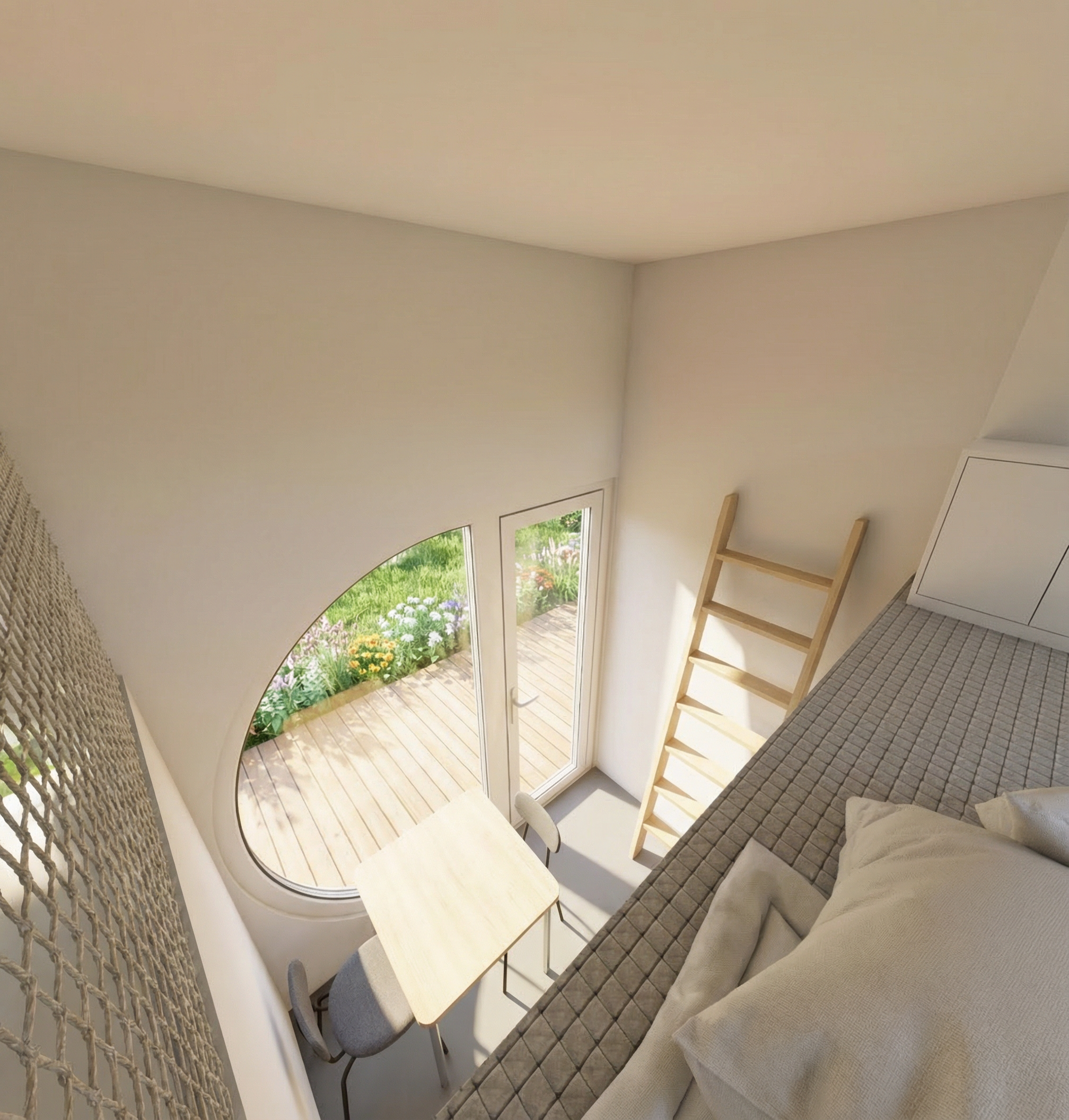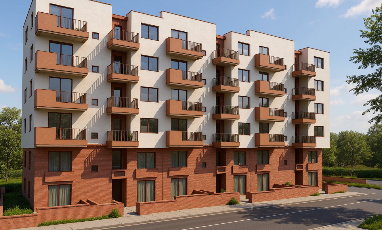 render a suburban neighborhood scene featuring modern minimalist houses each house has a sleek flat roof colored in dark gray with solar panels installed the exterior walls of the houses are a soft and made from plaster complementing the dark gray details 45 degrees angled wood paneling arrange the houses in neat rows along paved areas in a grid pattern center street is asphalt change red lines to dark grey metal fences lush round spherical scots pines with deep green foliage are evenly spaced along the streets casting soft shadows the pathways are a light paving gray while the lawns are a fresh muted green the atmosphere is serene with soft natural lighting creating a peaceful and organized suburban environment add few cars near buildings