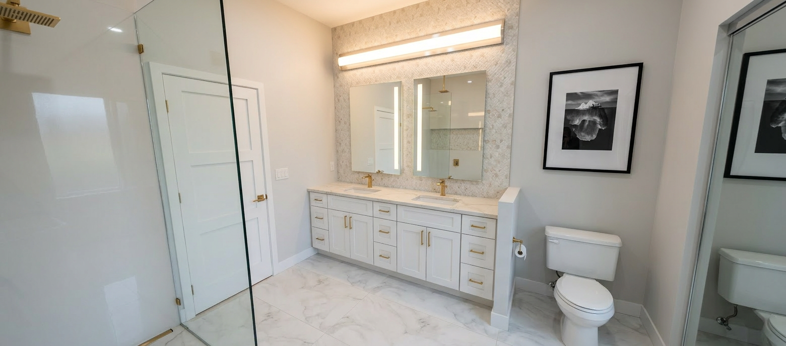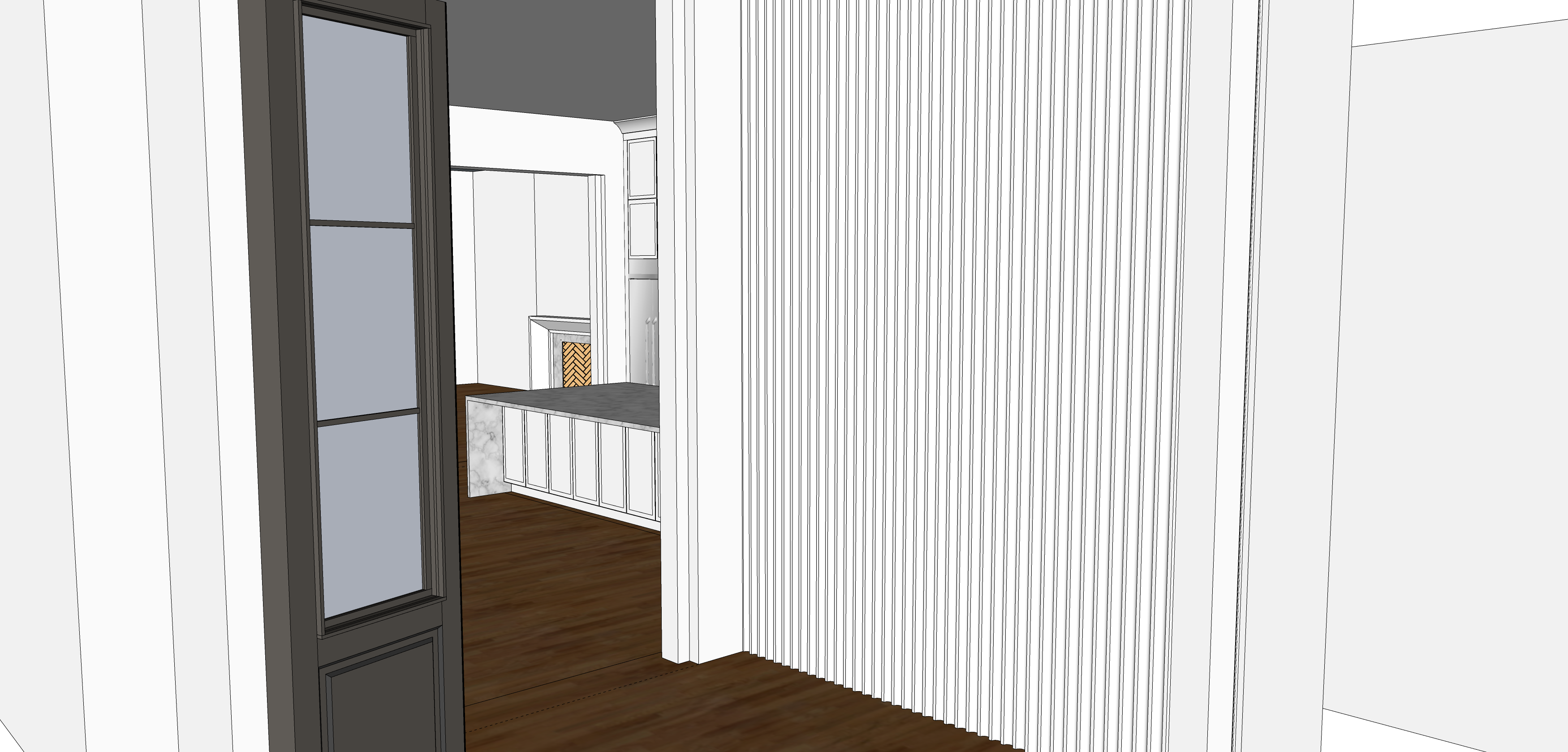 a cozy modern interior with a refined touch featuring a dark wooden door with frosted glass panels the walls are a soft off white providing a clean background for the warm rich brown hardwood floors a marble countertop in a cool grey tone adds elegance while the textured wall paneling enhances visual interest the atmosphere is serene and inviting with soft ambient lighting creating a gentle glow throughout the space