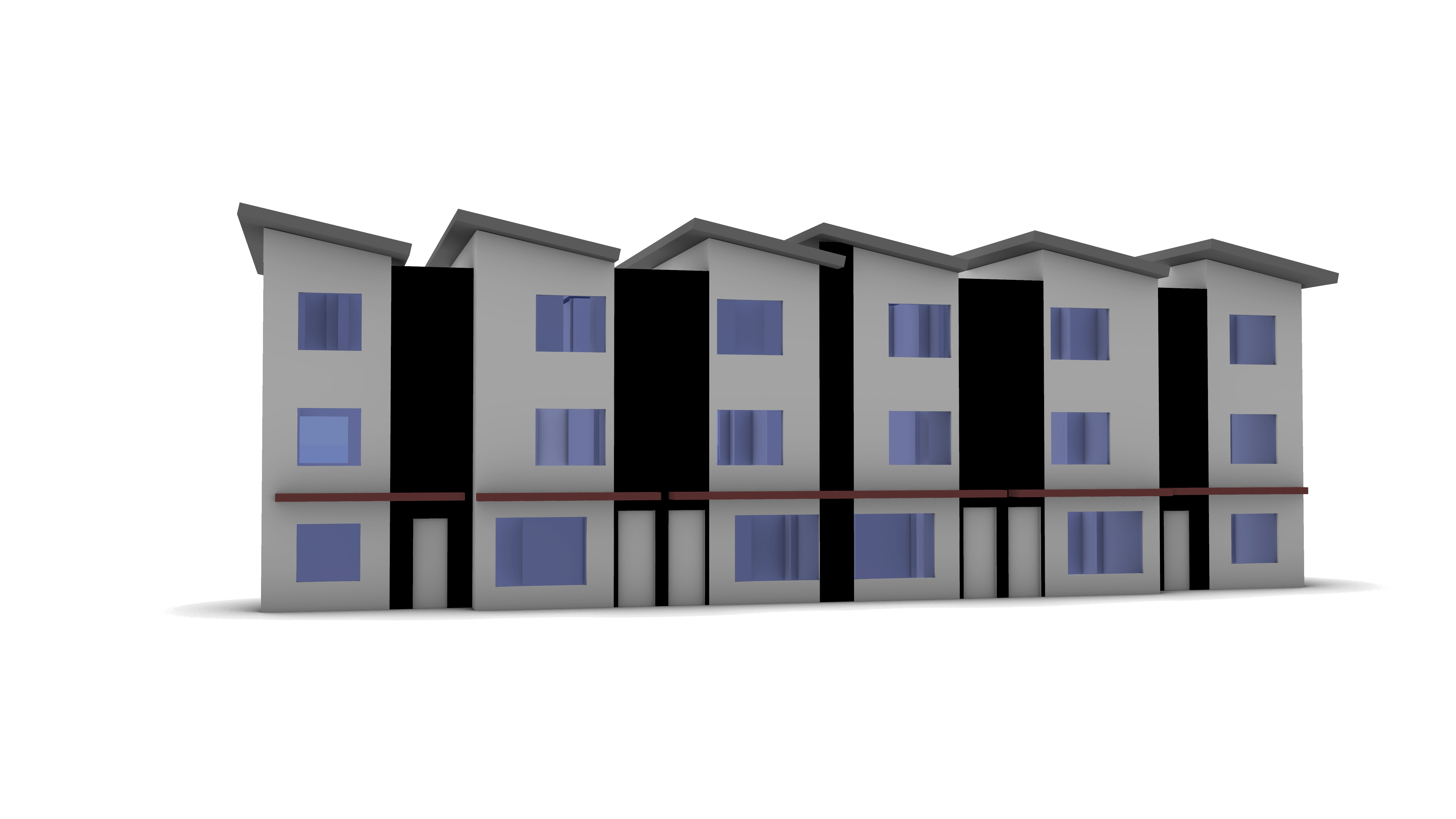 render this townhome building in a west coast modern style keeping all existing geometry and proportions exactly as shown use a refined material palette featuring dark metal panels smooth fiber cement or stucco in warm grey tones and moderate accents of natural wood such as vertical cedar cladding or soffit details to bring warmth and visual balance each vertical roof segment should read as a distinct unit by subtly varying the material combinations alternate between darker metal lighter grey panels and wood tones to create rhythm and individuality include black framed windows crisp detailing and restrained trim consistent with contemporary design the front fa ade should feature a modern front pathway leading to each unit with clean concrete or paver surfaces and low minimalist landscaping that complements the architecture lighting should be soft and natural to enhance texture depth and the material interplay characteristic of west coast modern design