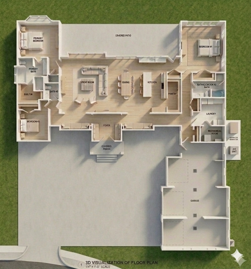 update the floor plan using context from the reference image update the drive way to look look like the reference image maintain the topdown 2d look remove all the divider walls from the garage