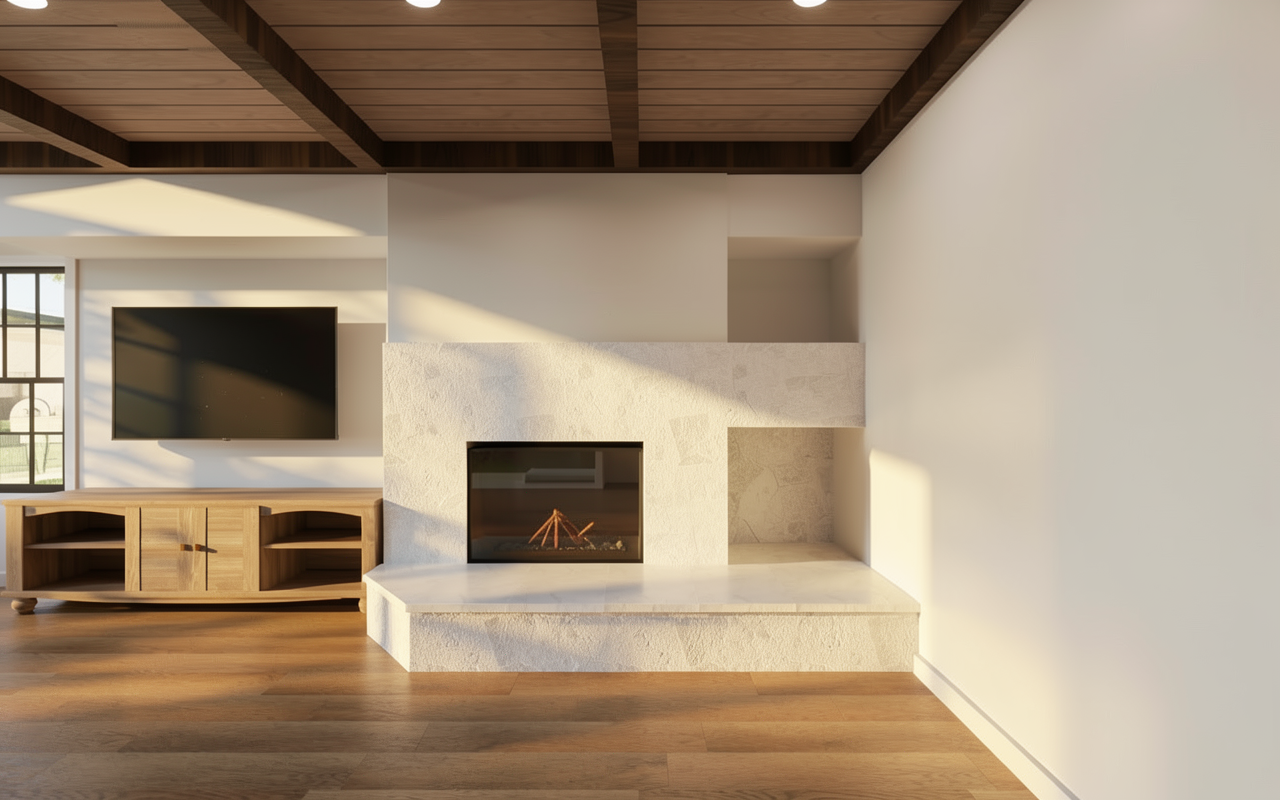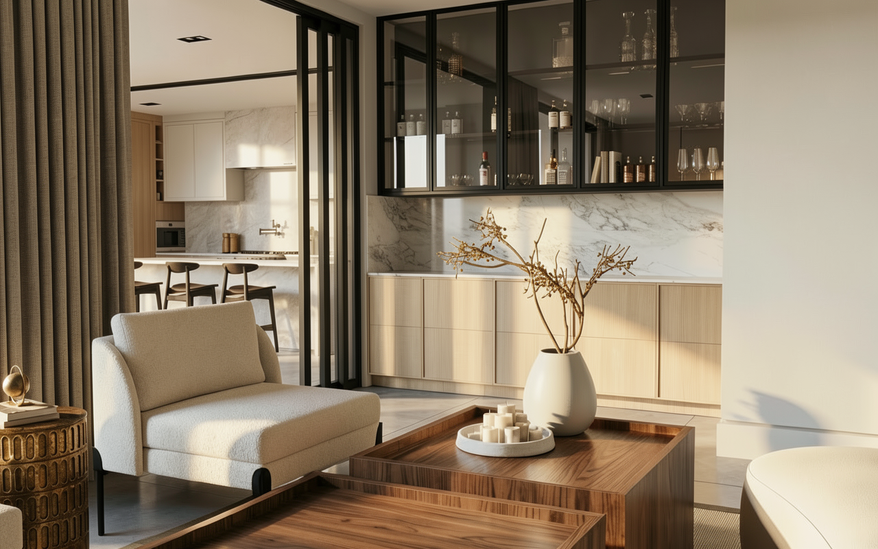 render a cozy intimate cafe setting under a wooden pergola adorned with hanging fairy lights casting a warm golden glow envelop the space with lush green foliage creating a serene atmosphere use brick textures on walls in earthy tones and deep brown leather seats arranged around polished wooden tables the floor should be a dark rustic wood incorporate rich dark red accents on window frames for an inviting touch change the chairs and the bench into modern ones that fit with the actual ones