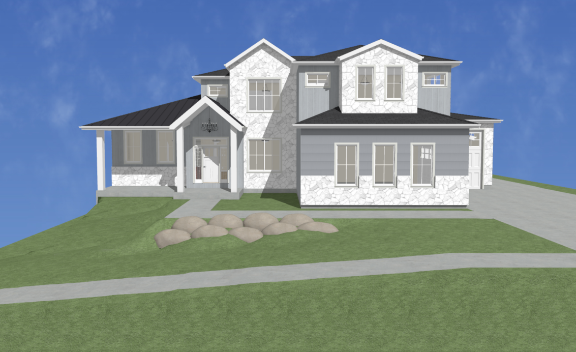 a manicured lawn layered flower beds low maintenance shrubs native plants stone pathway leading to the entrance a large lawn behind the home with pine trees