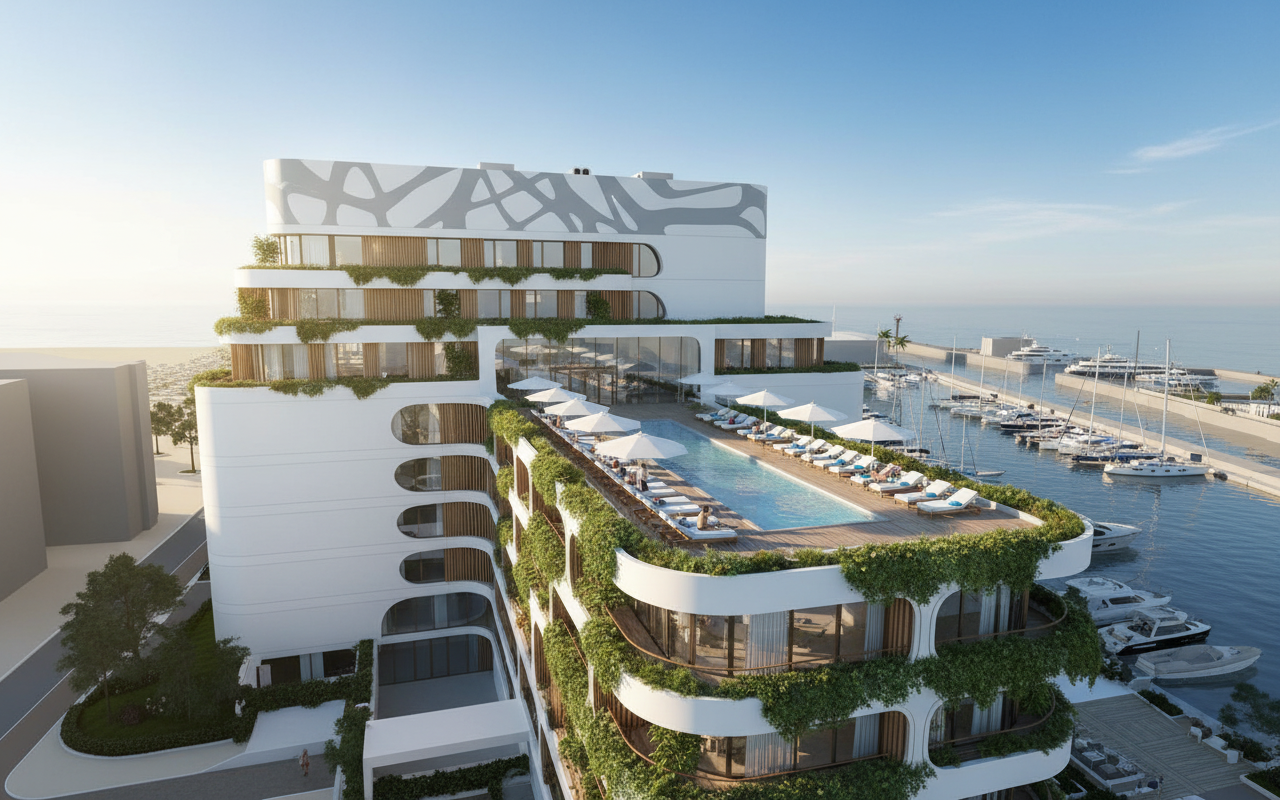 create a hyper realistic exterior photograph of a coastal house front exterior during dusk the house has a sleek tropical modern design with crisp white walls and white wood brackets the roof has dark gray cement tile large glass windows reflect the clear blue sky the garage door is white wood with some small glass openings palm trees with their lush green fronds add a tropical touch the house has surrounding green lawn the atmosphere is tranquil and luxurious with sunlight casting gentle shadows evoking a sense of relaxation and opulence