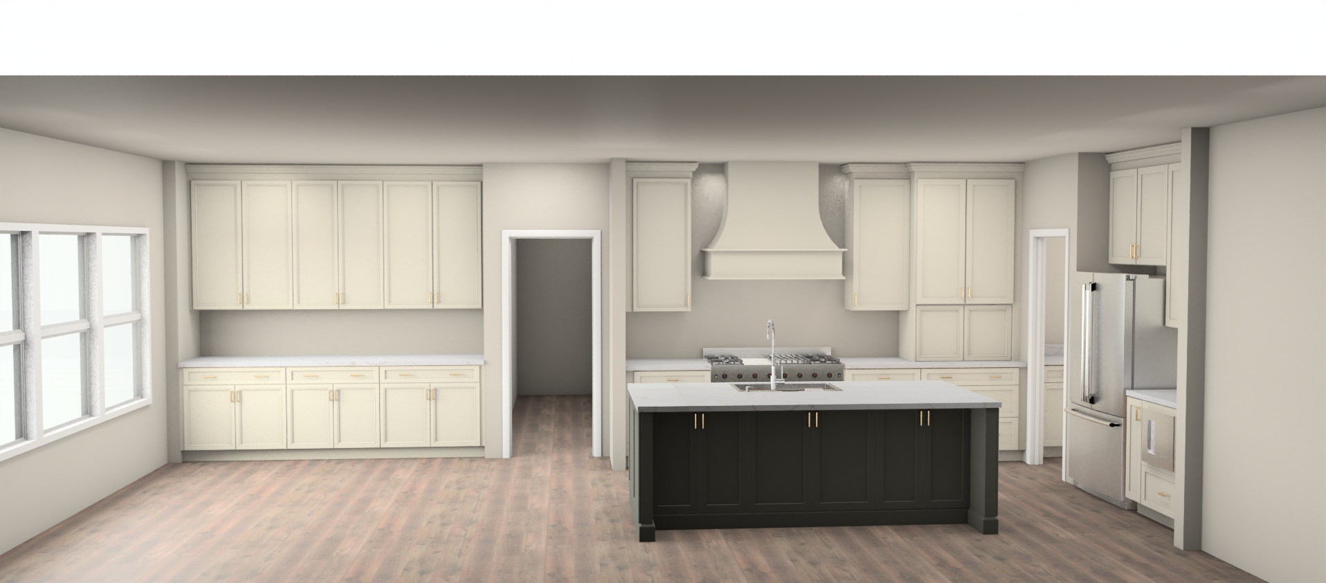 render a realistic transitional kitchen the perimeter cabinets and hood are alabaster with satin bronze handles adding a touch of luxury the kitchen island is thunderous by sherwin williams with the same gold handles creating a striking contrast the countertops are luce oro complementing the stainless steel appliances seamlessly the floor is a warm dark wood providing a cozy and inviting atmosphere the walls are painted a soft taupe enhancing the overall warmth and modernity