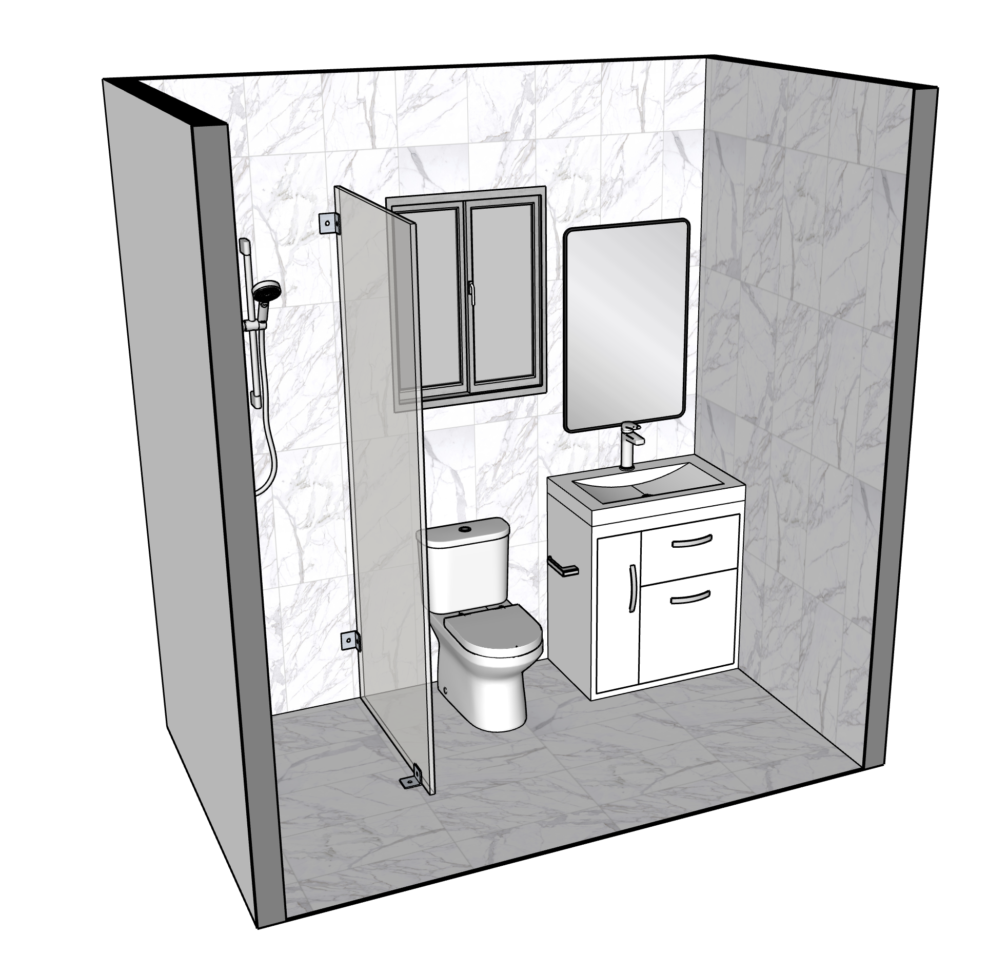 vanity is all white tiles are white marble fixtures are chrome window frame is black no background