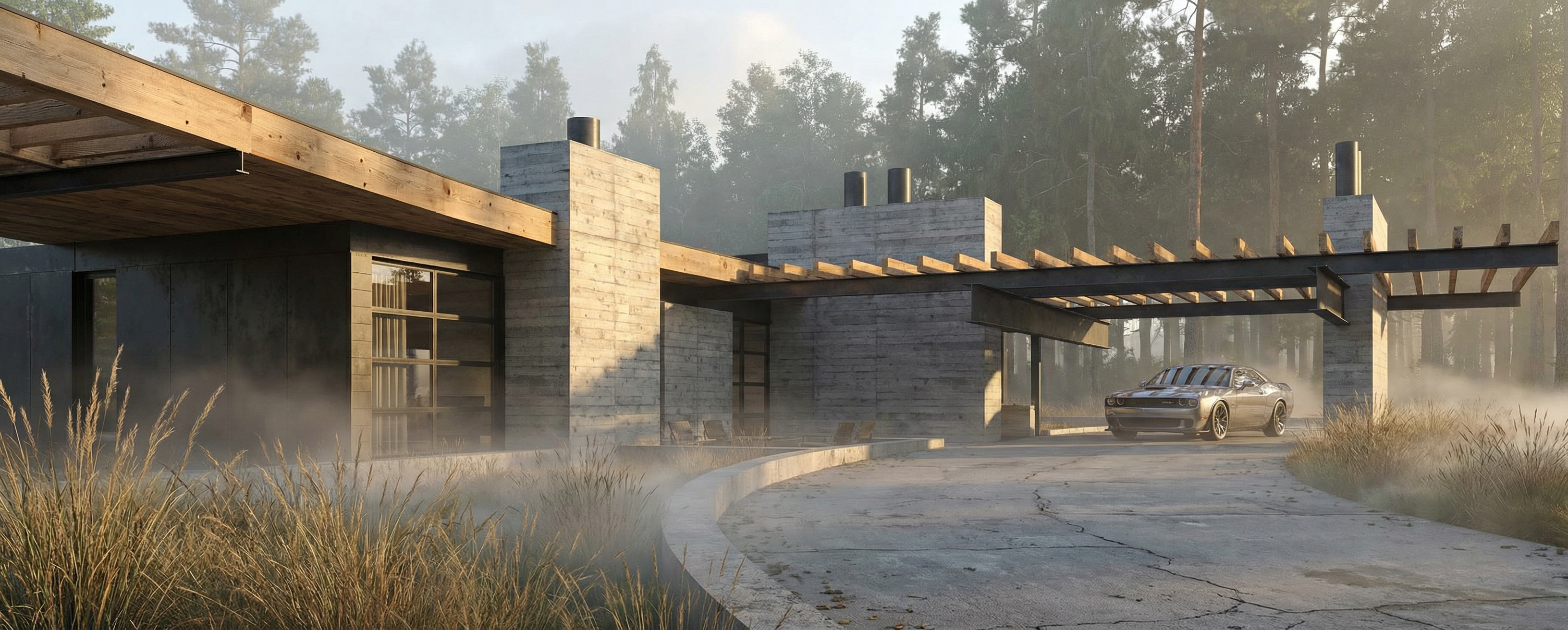 industrial home design corten steel and concrete panels tall grass foreground with river running through sunlight on building face