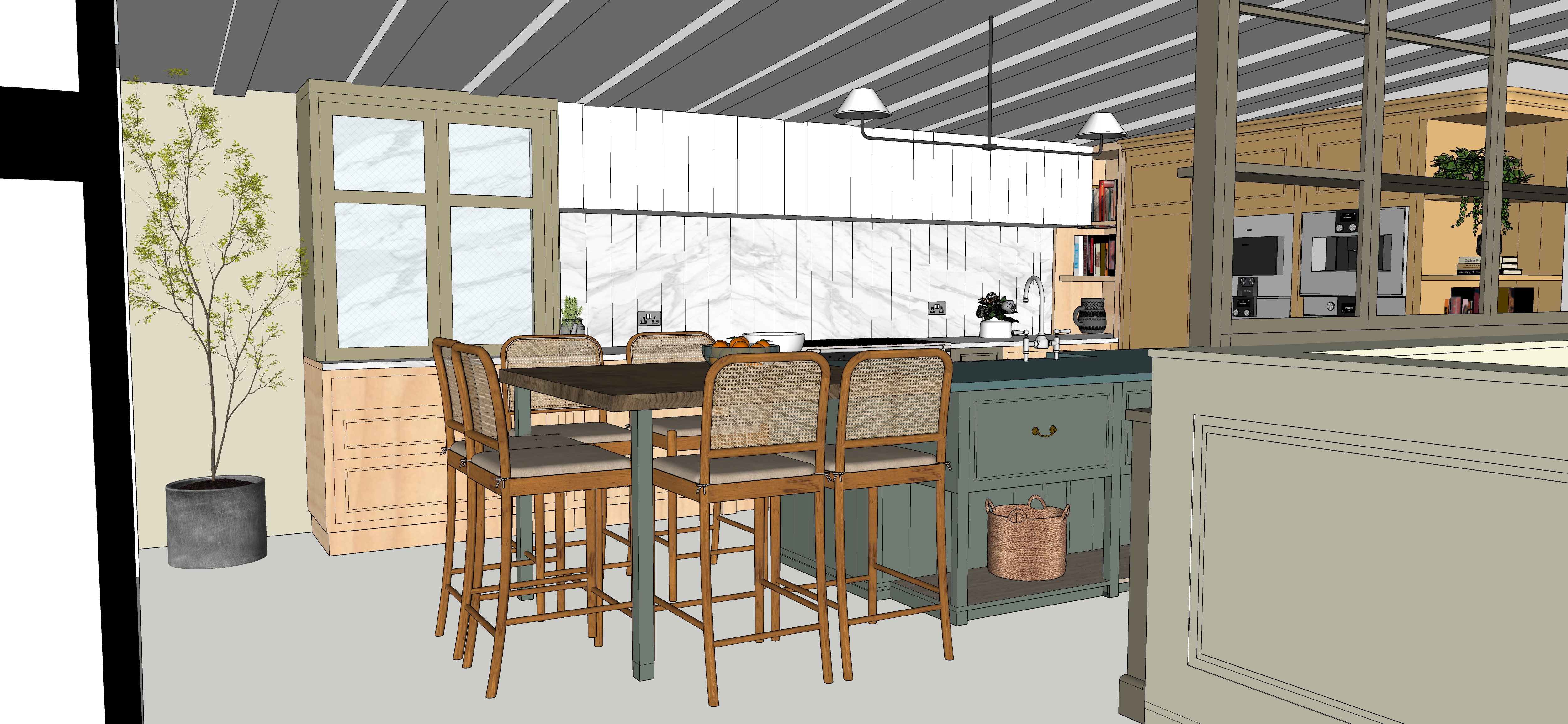 render image using materials shown in image add natural daylight and led lighting under wall cabinets splashback with tongue groove marble