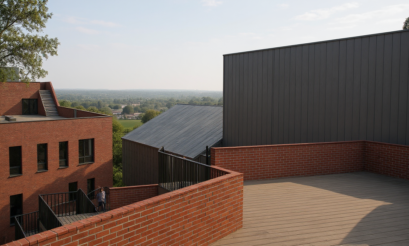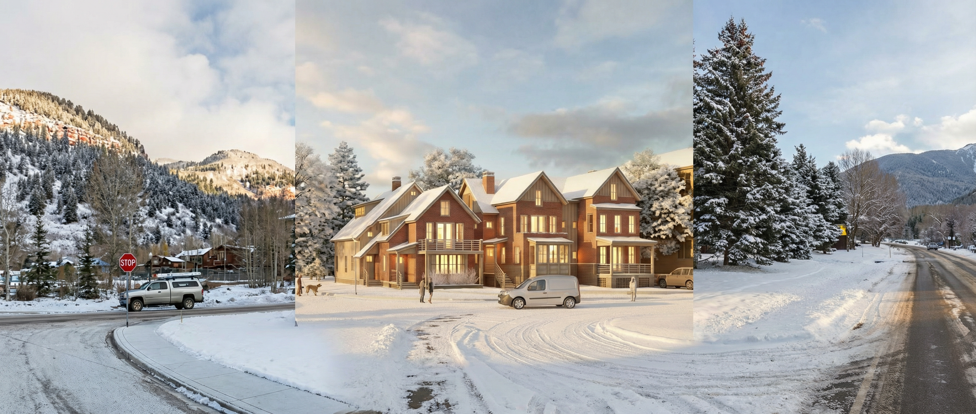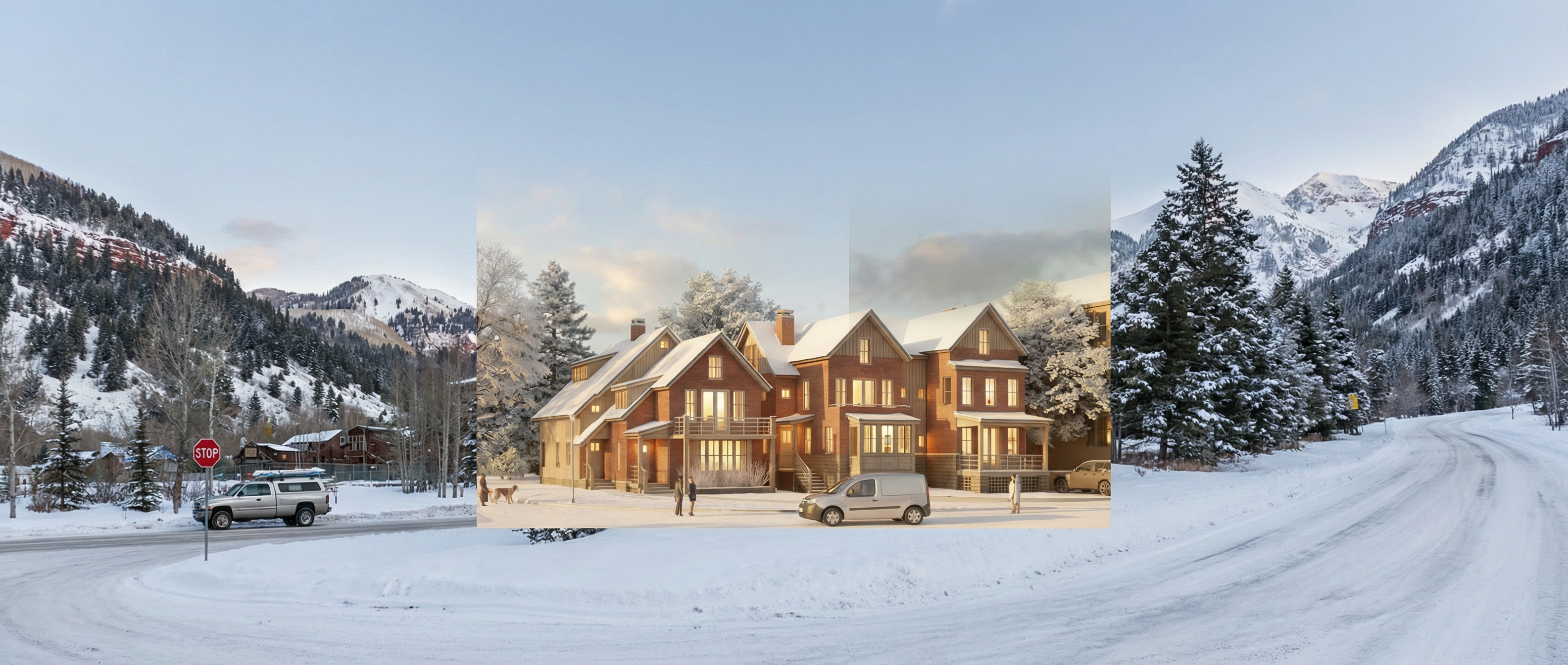 lets do a nice render of this scene keep the buildings the same and add snow on the mountain