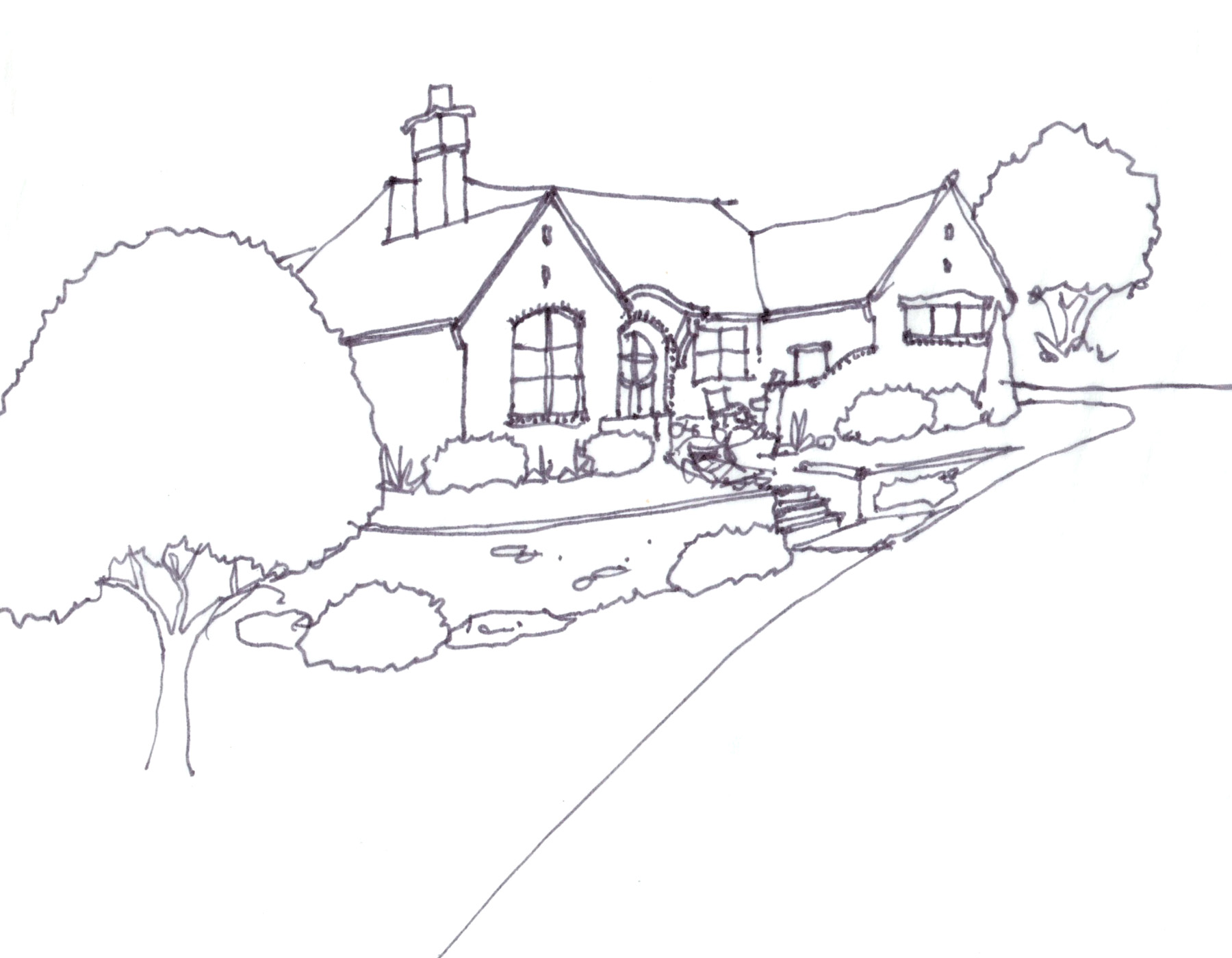flat tile roof with heavy slurry exterior brick window surrounds black metal window frames stone retaining wall below