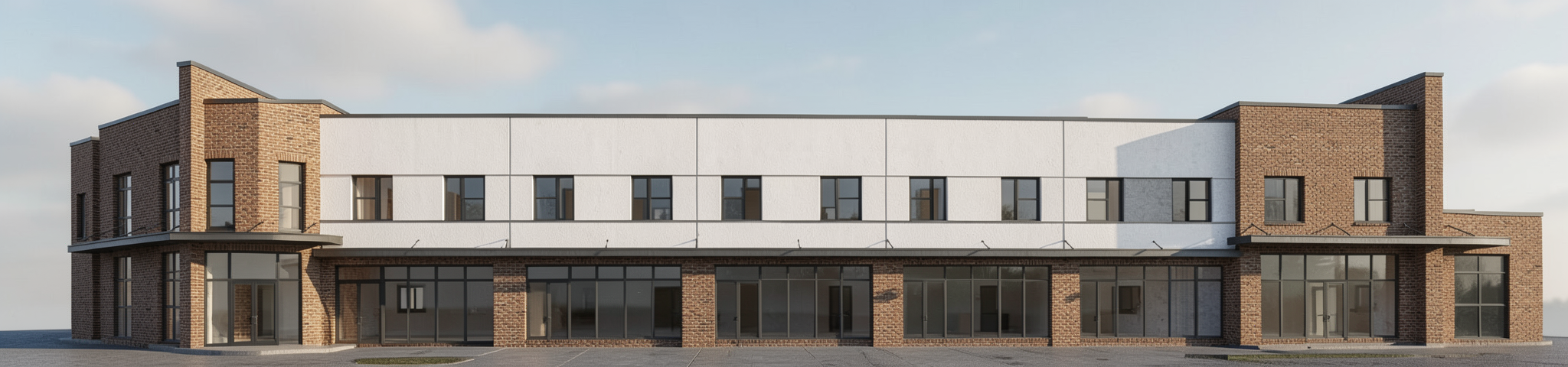 generate a photorealistic high quality rendering of this image use brick in the brown color use laminate in gray area use stucco in white area make it look modern industrial style