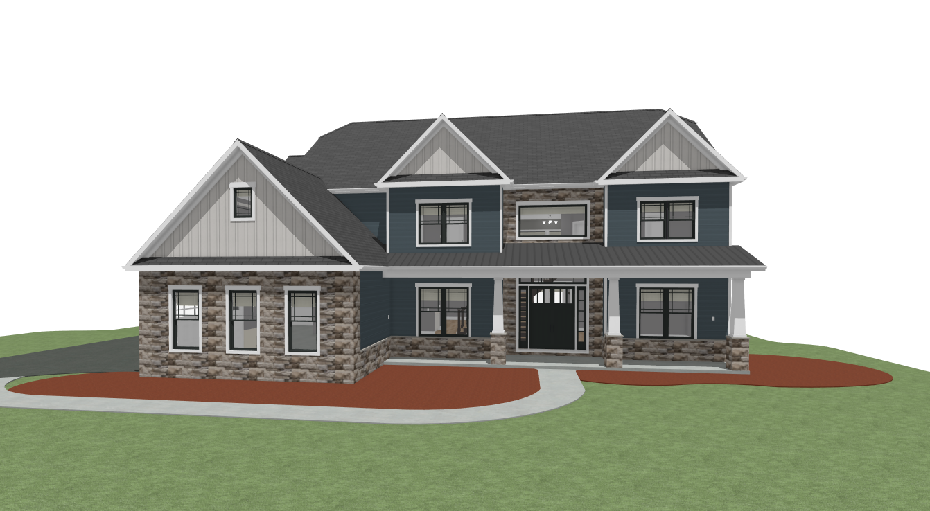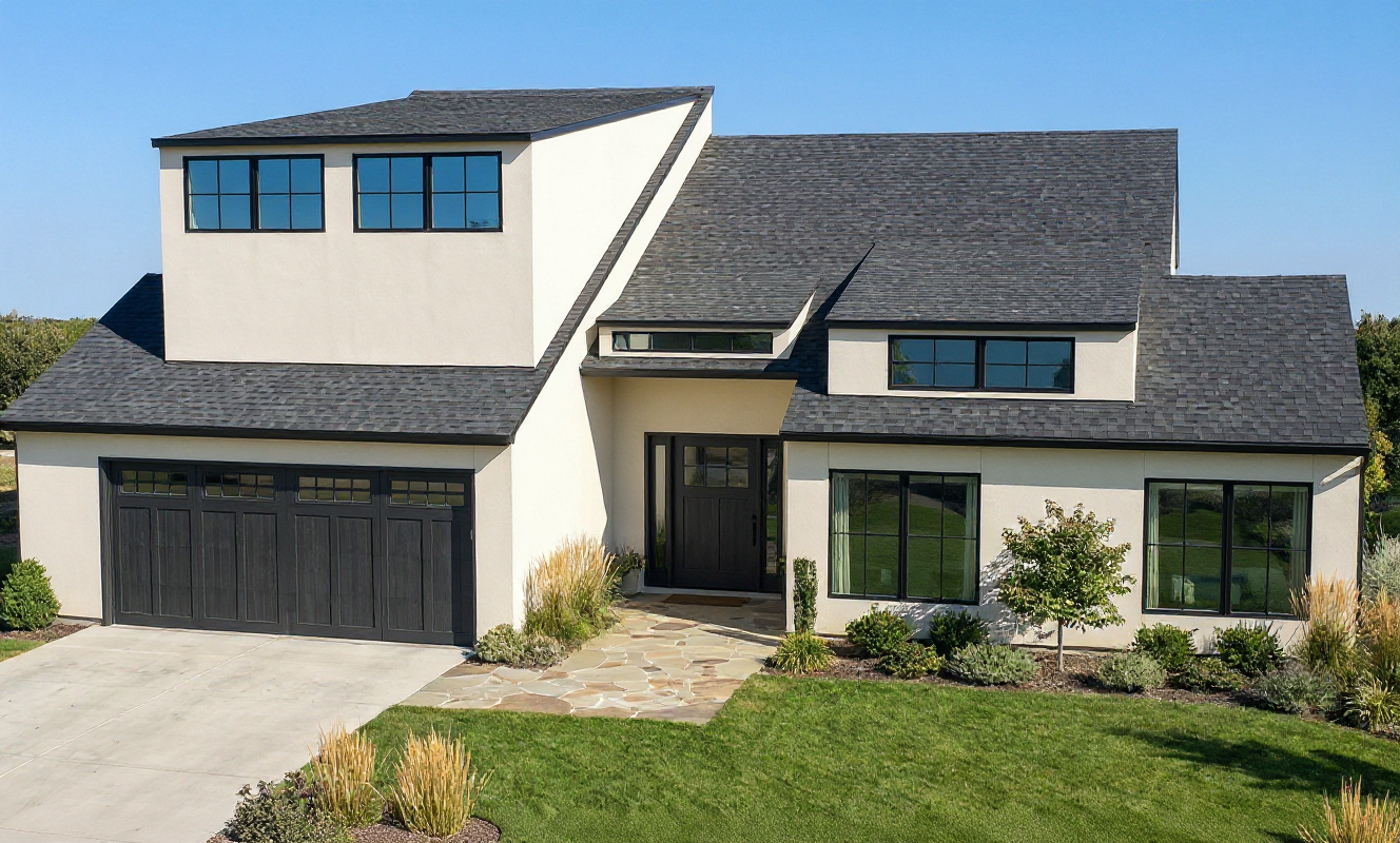 render this 3d image to appear photo realistic maintain all existing architectural materials and structural elements exactly as shown enhance the setting with a lush well maintained landscape include minimal beds manicured shrubs and a tree lined backdrop that frames the home naturally the windows should have a glossy finish with clear reflections of the surrounding trees and sky lighting should feel natural with soft shadows and realistic depth to bring the scene to life