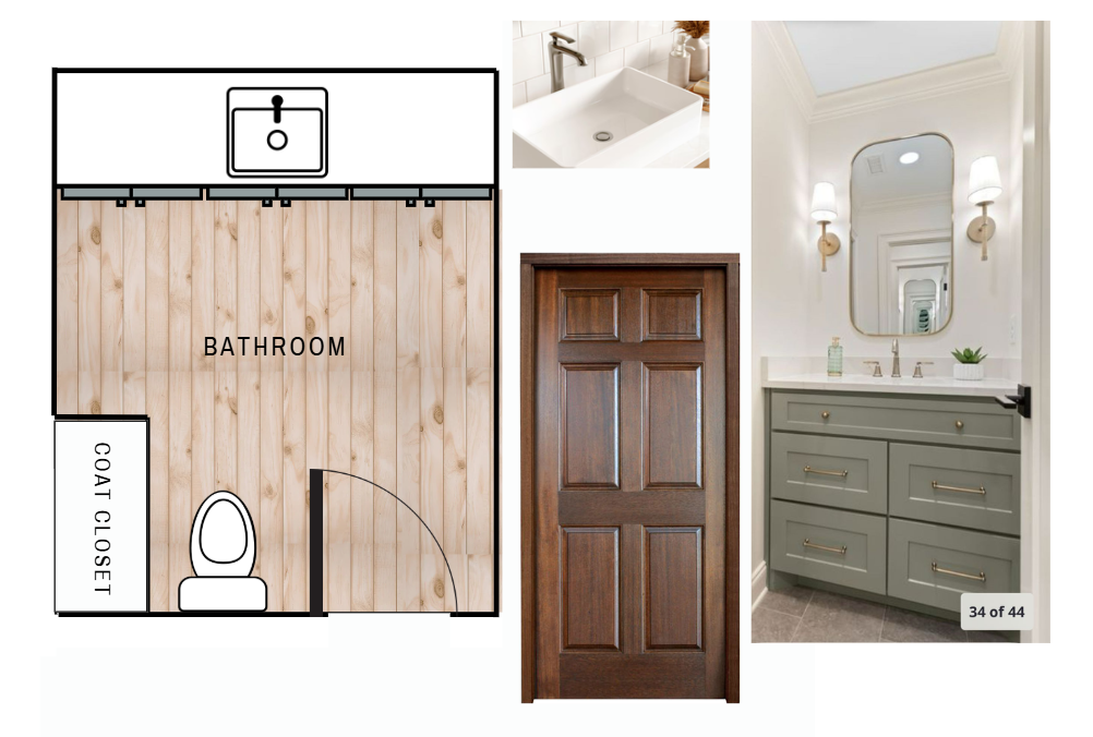 create a realistic bathroom interior based on this layout and inspiration board strictly follow the provided floor plan layout do not move or change the position of walls door toilet sink convert this into a fully rendered realistic bathroom from a bird eye angle from above use the inspiration images for style including vanity design and color mirror and lighting style light wood flooring door style 5 panel warm wood door finishes and materials maintain accurate proportions and spatial relationships from the layout create a warm clean high end residential bathroom design suitable for a client presentation