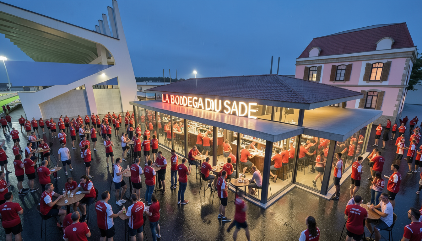 architectural visualization of the pavilion la bodega du stade next to the rugby stadium in biarritz keep the exact architecture geometry and volumes unchanged transform the atmosphere into a festive outdoor guinguette environment for rugby supporters add colorful fanions triangular flags stretched between the pavilion and nearby structures warm string lights and guirlandes hanging under the roof overhang and around the terrace remove most tables from the interior to create a more open standing social space people standing with drinks supporters wearing red and white rugby colors relaxed pre match atmosphere warm evening lighting soft golden lights from the guirlandes natural ground without reflections lively but elegant architectural context realistic but slightly cinematic architectural rendering